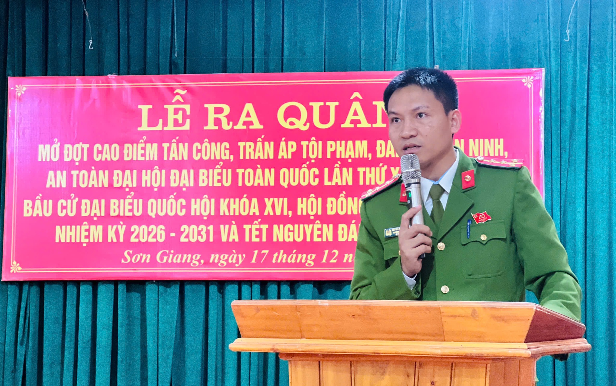 Quán triệt tinh thần chỉ đạo của cấp trên, tại buổi lễ, Công an xã Sơn Giang đã phát mệnh lệnh ra quân toàn lực lượng, chính thức triển khai đợt cao điểm tấn công, trấn áp tội phạm với quyết tâm cao nhất. Theo đó, lực lượng Công an xã tập trung chủ động tham mưu cho cấp ủy, chính quyền địa phương chỉ đạo huy động sức mạnh tổng hợp của các ban, ngành, đoàn thể và Nhân dân tham gia phòng, chống tội phạm; tăng cường nắm chắc tình hình từ sớm, từ xa, ngay tại cơ sở, không để bị động, bất ngờ.