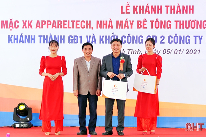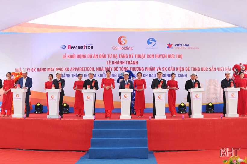 Lãnh đạo tỉnh Hà Tĩnh và đại diện các nhà đầu tư thực hiện nghi thức khởi động dự án đầu tư hạ tầng kỹ thuật CCN huyện Đức Thọ; khánh thành các dự án: Nhà máy May mặc xuất khẩu Appritech, Nhà máy Bê tông thương phẩm và cấu kiện đúc sẵn Viết Hải, Nhà máy Bao bì Sông La Xanh.