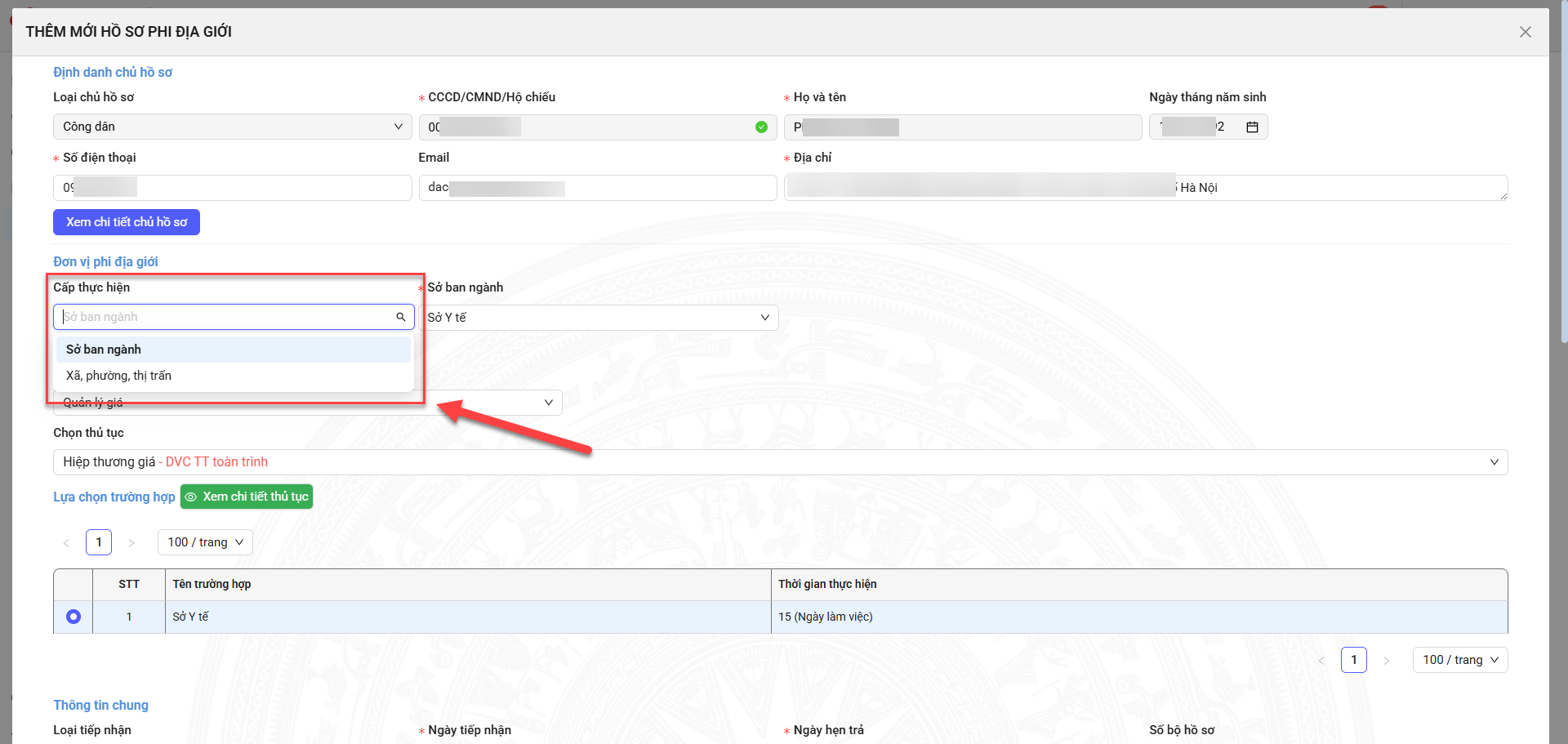 − Bước 2: Chọn cấp thực hiện thủ tục