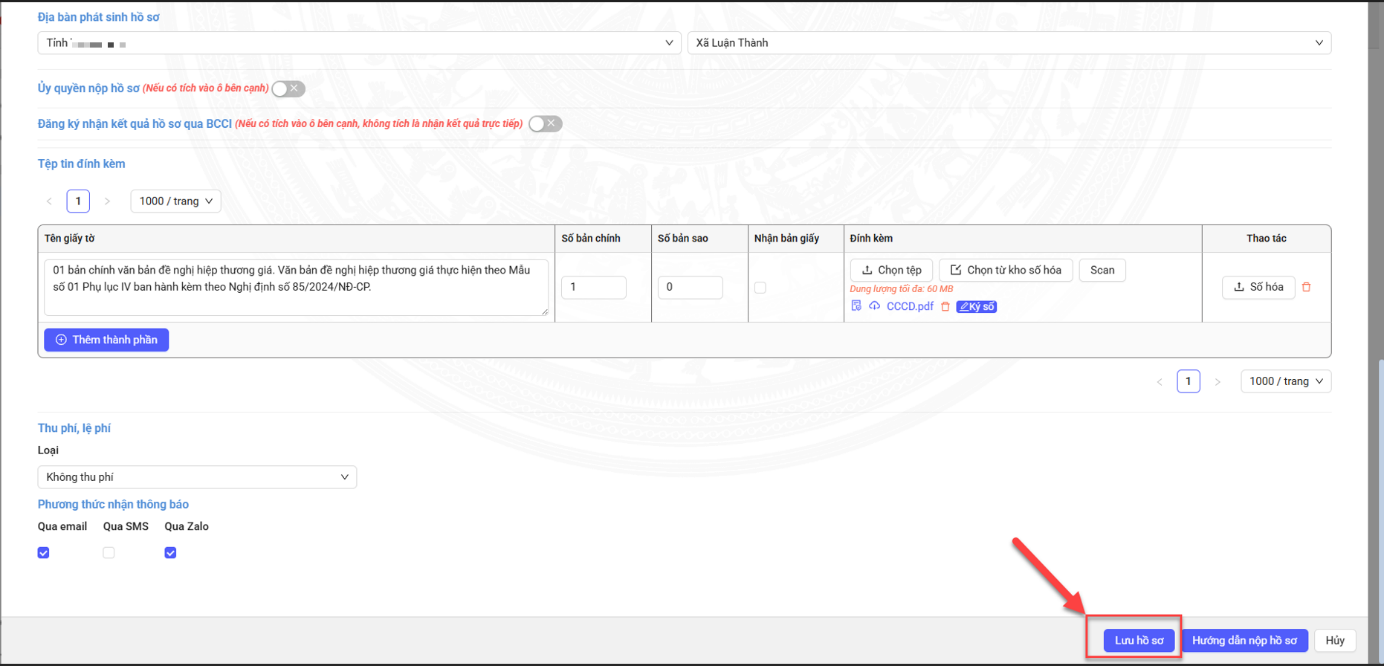 − Bước 4: Sau khi nhập nhập đầy đủ thông tin thành phần hồ sơ cán bộ tiếp nhận chọn Lưu