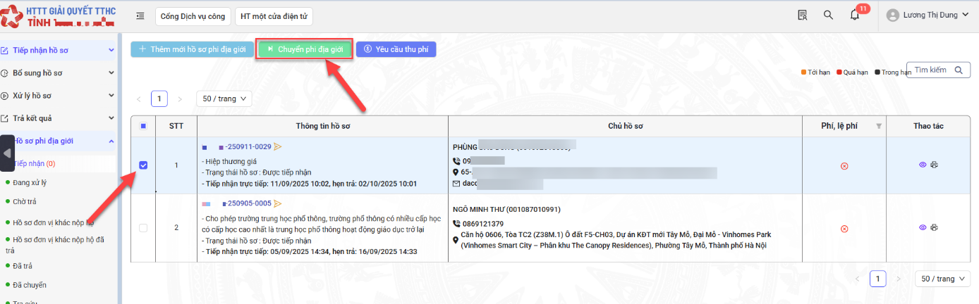 − Bước 5: Cán bộ tiếp nhận chọn hồ sơ Chọn Chuyển phi địa giới. Hồ sơ sẽ chuyển đến phòng chuyên môn của đơn vị xử lý.