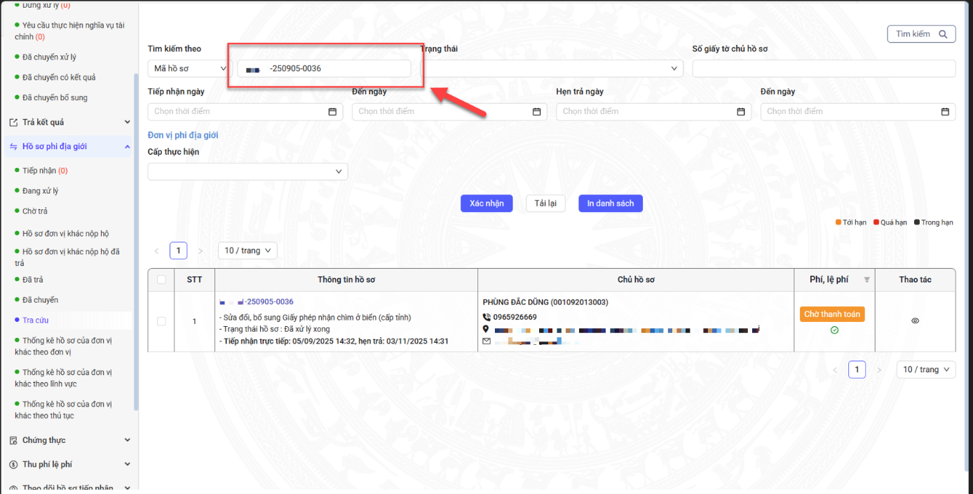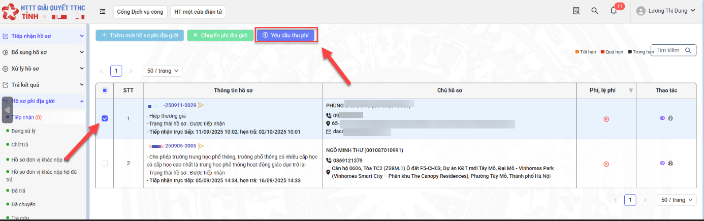 − Bước 1: Chọn hồ sơ cần yêu cầu thu phí Yêu cầu thu phí