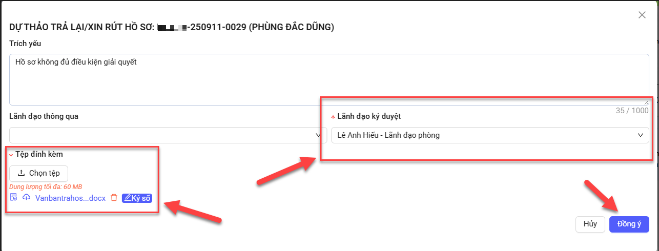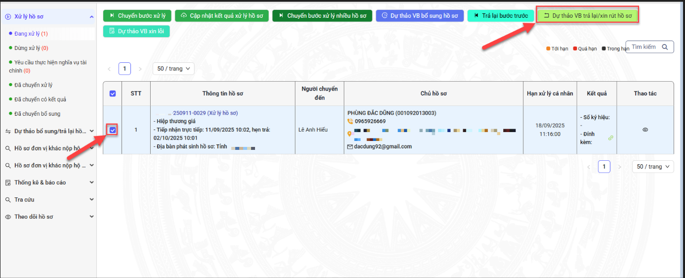 Trường hợp hồ sơ chuyển đến đơn xử lý nhưng không đủ điều kiện giải quyết. Chuyên viên xử lý chọn hồ sơ Dự thảo VB trả lại/Xin rút