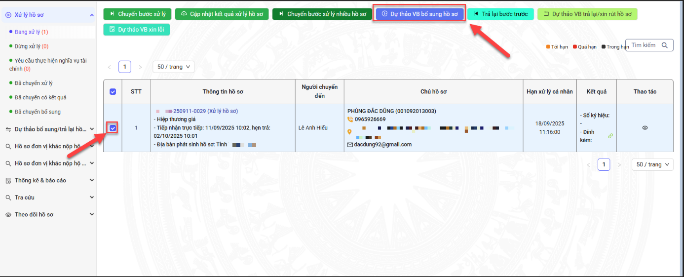 Trường hợp hồ sơ chuyển đến đơn xử lý nhưng thiêu thành giải quyết. Chuyên viên xử lý chọn hồ sơ Dự thảo VB bổ sung hồ sơ