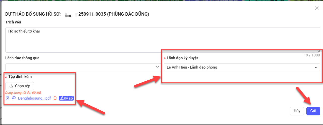Cán bộ xử lý nhập các thông tin như hình dưới Gửi