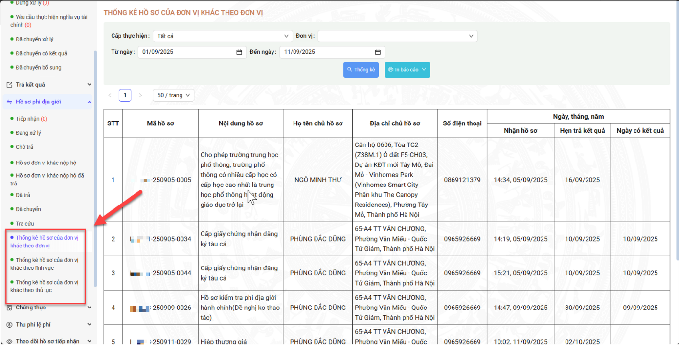 Cán bộ tiếp nhận có thể thống kê hồ sơ phi địa giới đã xử lý theo: thủ tục, đơn vị, lĩnh vực.