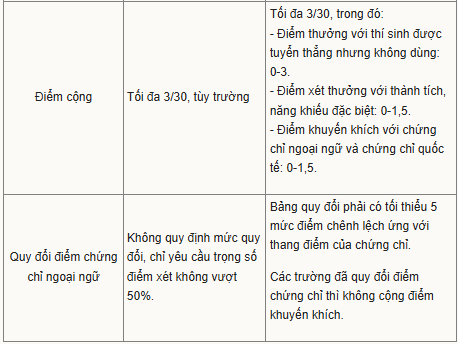 Về điểm cộng, nếu trước đây Bộ không quy định cụ thể, thì nay chia thành ba loại, dù tổng vẫn là 3/30. Thí sinh có chứng chỉ ngoại ngữ quốc tế không còn hưởng lợi thế kép, vừa được quy đổi, vừa được cộng điểm ưu tiên như năm ngoái.
