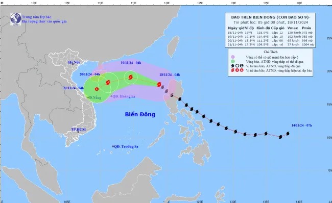 Cụ thể, hồi 4h ngày 18/11, vị trí tâm bão ở vào khoảng 18,0 độ Vĩ Bắc; 118,9 độ Kinh Đông, trên vùng biển phía Đông của khu vực Bắc Biển Đông. Sức gió mạnh nhất vùng gần tâm bão mạnh cấp 11-12 (103-133km/h), giật cấp 15. Di chuyển theo hướng Tây Bắc, tốc độ khoảng 25km/h.