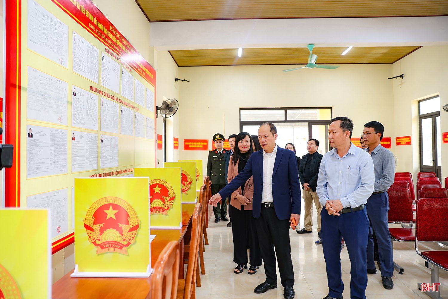 Đồng chí Nguyễn Hồng Lĩnh - Phó Bí thư Thường trực Tỉnh ủy, Chủ tịch HĐND tỉnh, Chủ tịch Ủy ban bầu cử tỉnh kiểm tra tại khu vực bỏ phiếu thôn 11, xã Thạch Hà.
