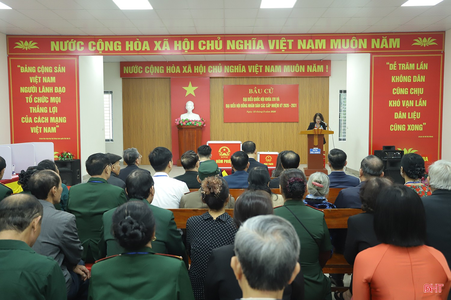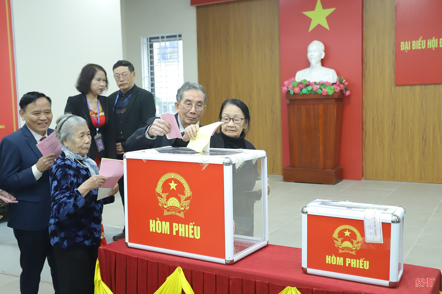 Sau nghi thức khai mạc, tổ bầu cử tiến hành thủ tục kiểm tra, niêm phong hòm phiếu, dưới sự giám sát của cử tri. Các cử tri kiểm tra thông tin, nhận phiếu và bỏ phiếu theo đúng quy định. Không khí tại khu vực bỏ phiếu diễn ra nghiêm túc, dân chủ. Công tác an ninh trật tự được đảm bảo.