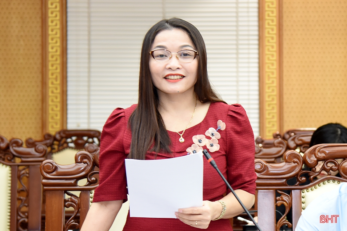 Phó Trưởng ban Thường trực Ban Tuyên giáo Tỉnh ủy Nguyễn Thị Hà Tân báo cáo tiến độ triển khai các nội dung hướng tới lễ kỷ niệm.