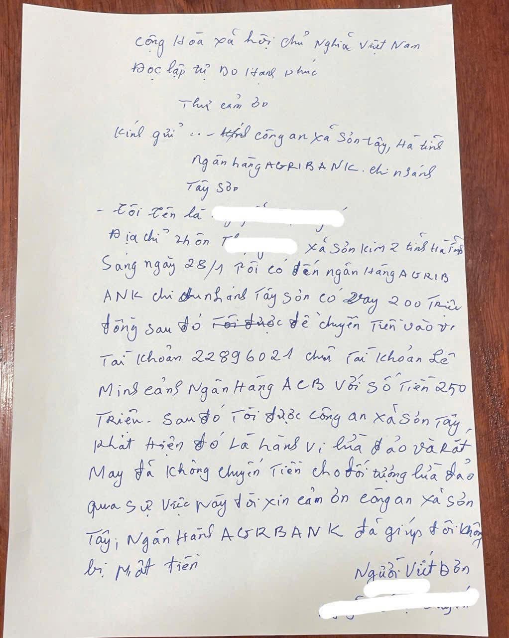Xúc động trước tinh thần trách nhiệm, sự tận tâm vì Nhân dân phục vụ của lực lượng Công an xã Sơn Tây và cán bộ, nhân viên Ngân hàng AGRIBANK Chi nhánh Tây Sơn, bà N. đã viết thư cảm ơn, bày tỏ sự trân trọng và biết ơn sâu sắc đối với sự hỗ trợ kịp thời của các lực lượng chức năng.