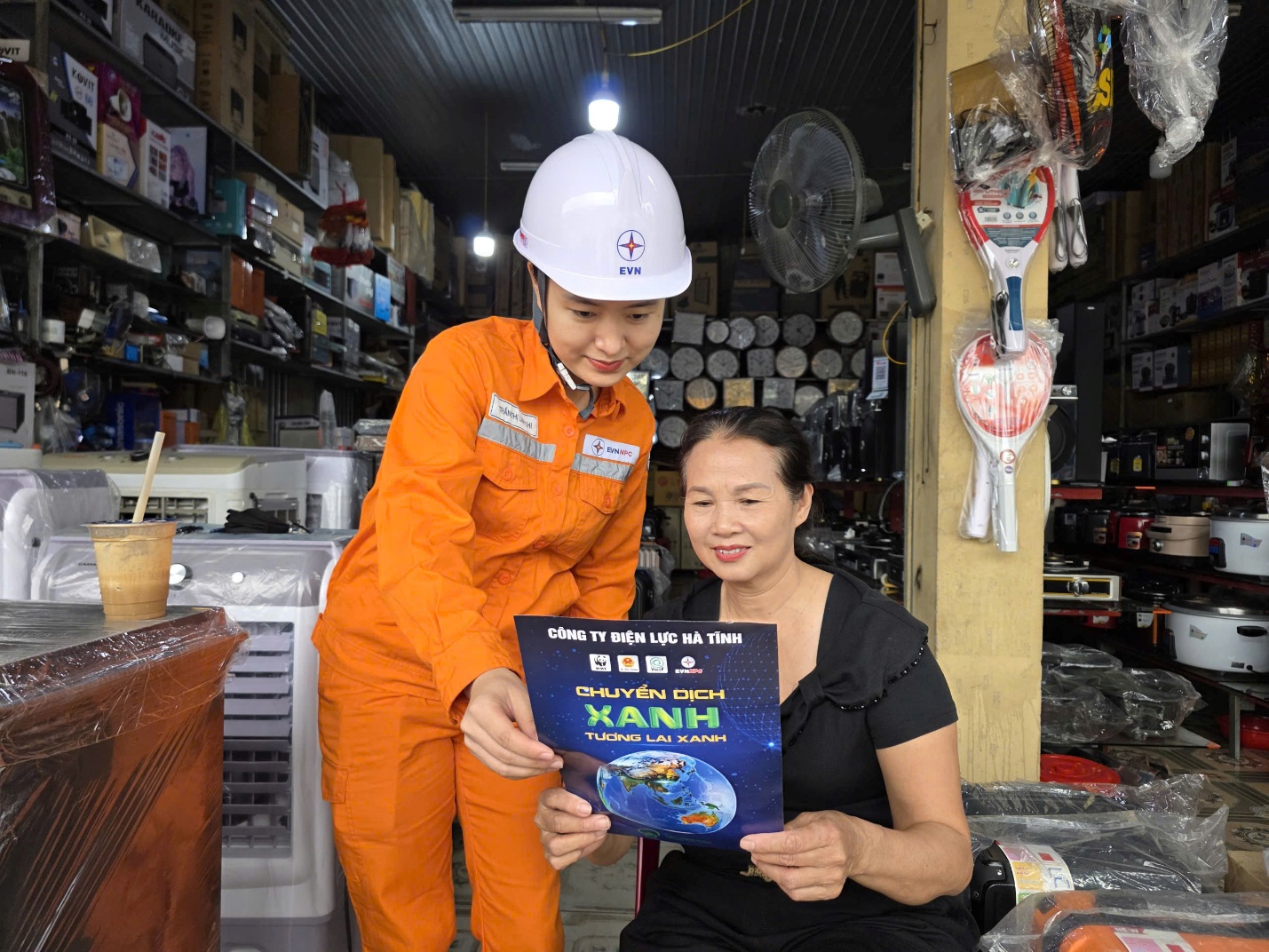 Cán bộ điện lực tuyên truyền, phát tờ rơi đến người dân, vận động hưởng ứng Giờ Trái đất.