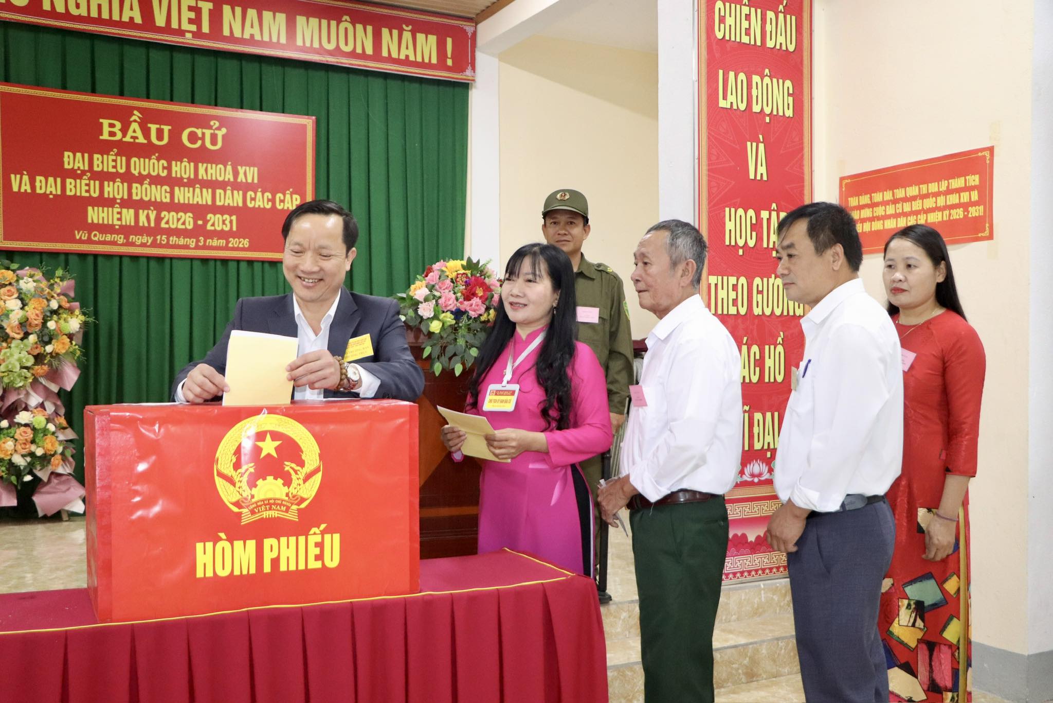 Sáng 15/3, trong không khí trang nghiêm và phấn khởi của Ngày hội toàn dân, xã Vũ Quang đã tổ chức khai mạc và tiến hành bầu cử đại biểu Quốc hội khóa XVI và đại biểu HĐND các cấp nhiệm kỳ 2026 – 2031. Đông đảo cử tri trên địa bàn xã đã đến các khu vực bỏ phiếu từ sớm để thực hiện quyền và nghĩa vụ công dân của mình.