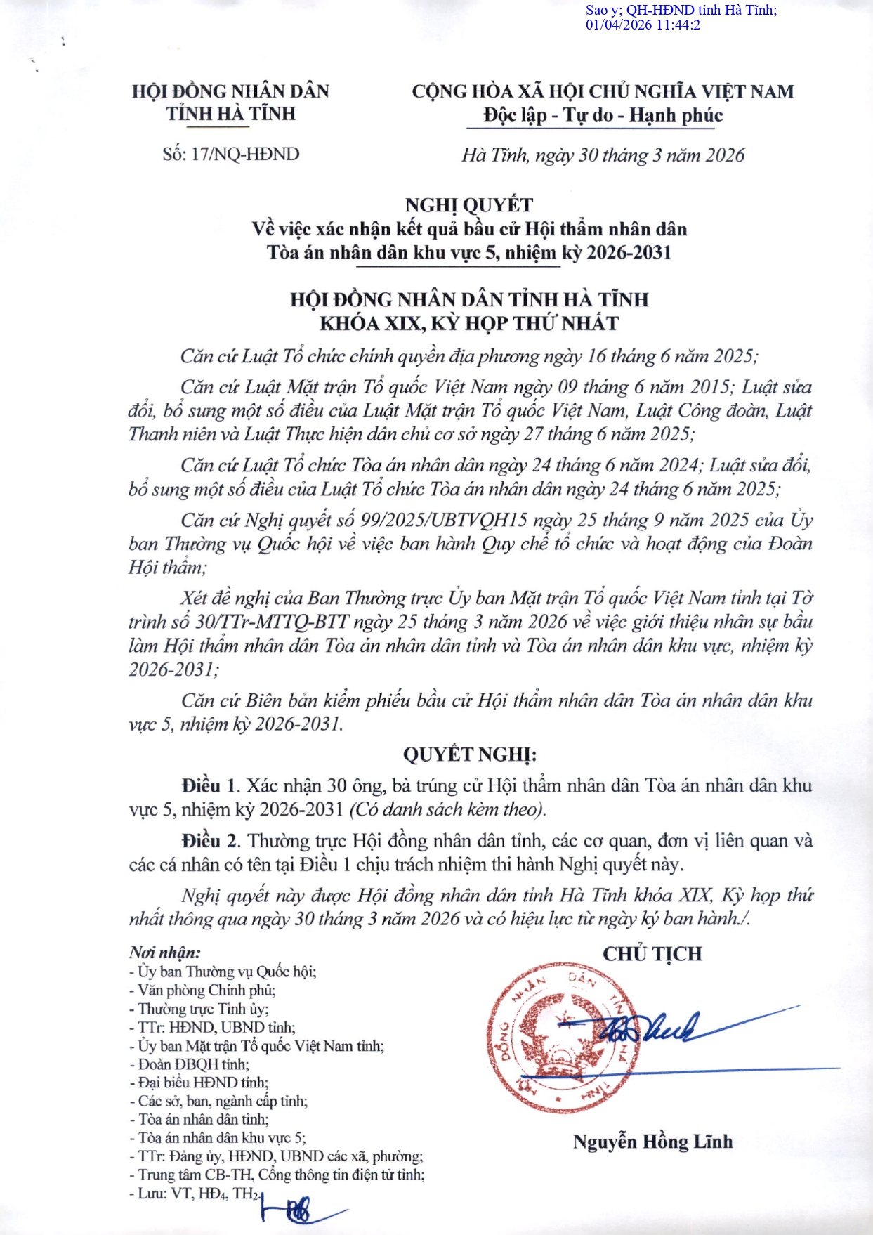 HĐND tỉnh Hà Tĩnh vừa ban hành Nghị quyết số 14/NQ-HĐND ngày 30/3/2026 về việc xác nhận kết quả bầu cử Hội thẩm nhân dân Tòa án nhân dân khu vực 5, nhiệm kỳ 2026-2031.