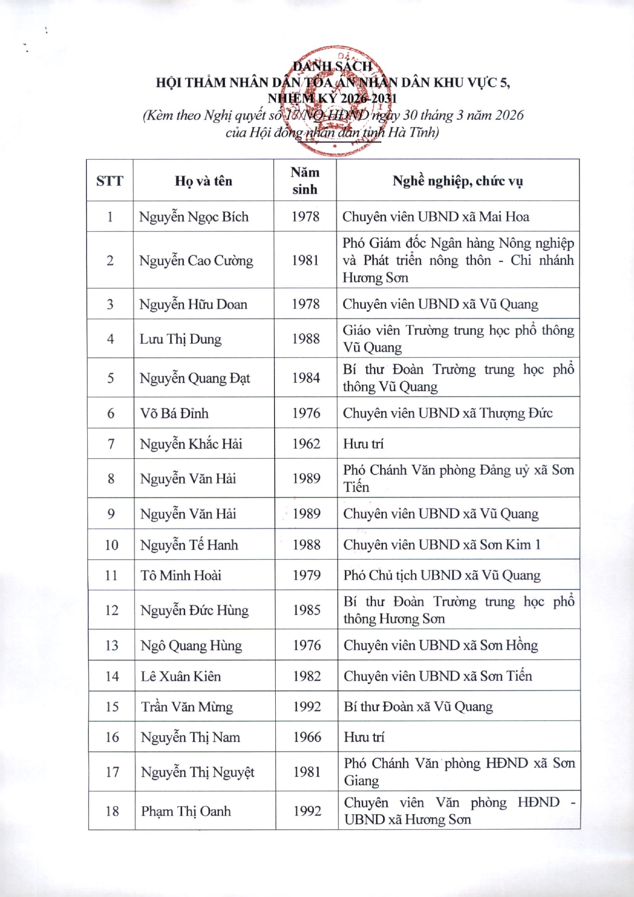 Cổng Thông tin điện tử tỉnh Hà Tĩnh thông tin danh sách chính thức 30 ông, bà trúng cử Hội thẩm nhân dân Toà án nhân dân khu vực 5, nhiệm kỳ 2026-2031 đến quý độc giả.