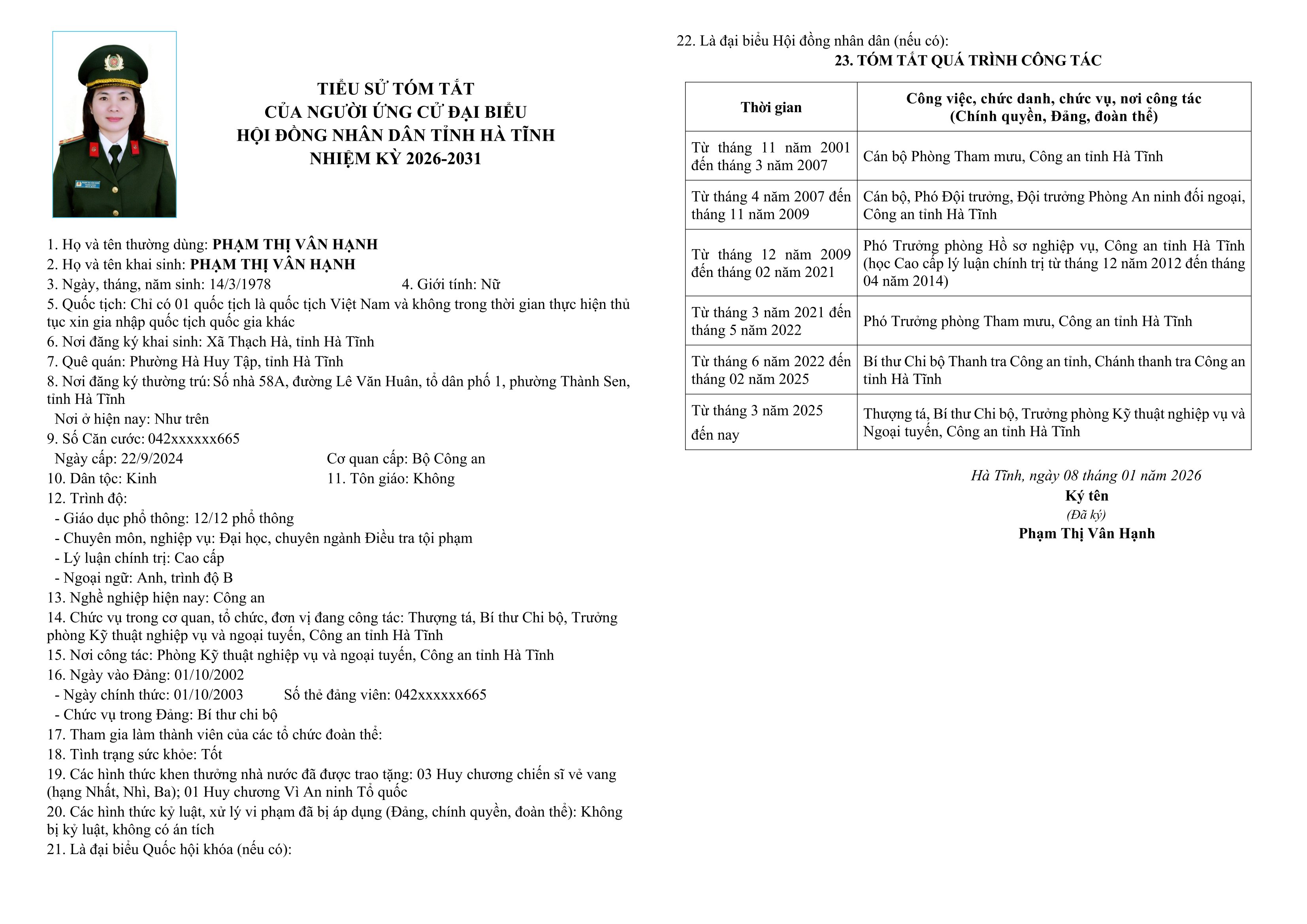 3. Bà Phạm Thị Vân Hạnh - Thượng tá; Bí thư Chi bộ, Trưởng phòng Kỹ thuật nghiệp vụ và ngoại tuyến, Công an tỉnh Hà Tĩnh.