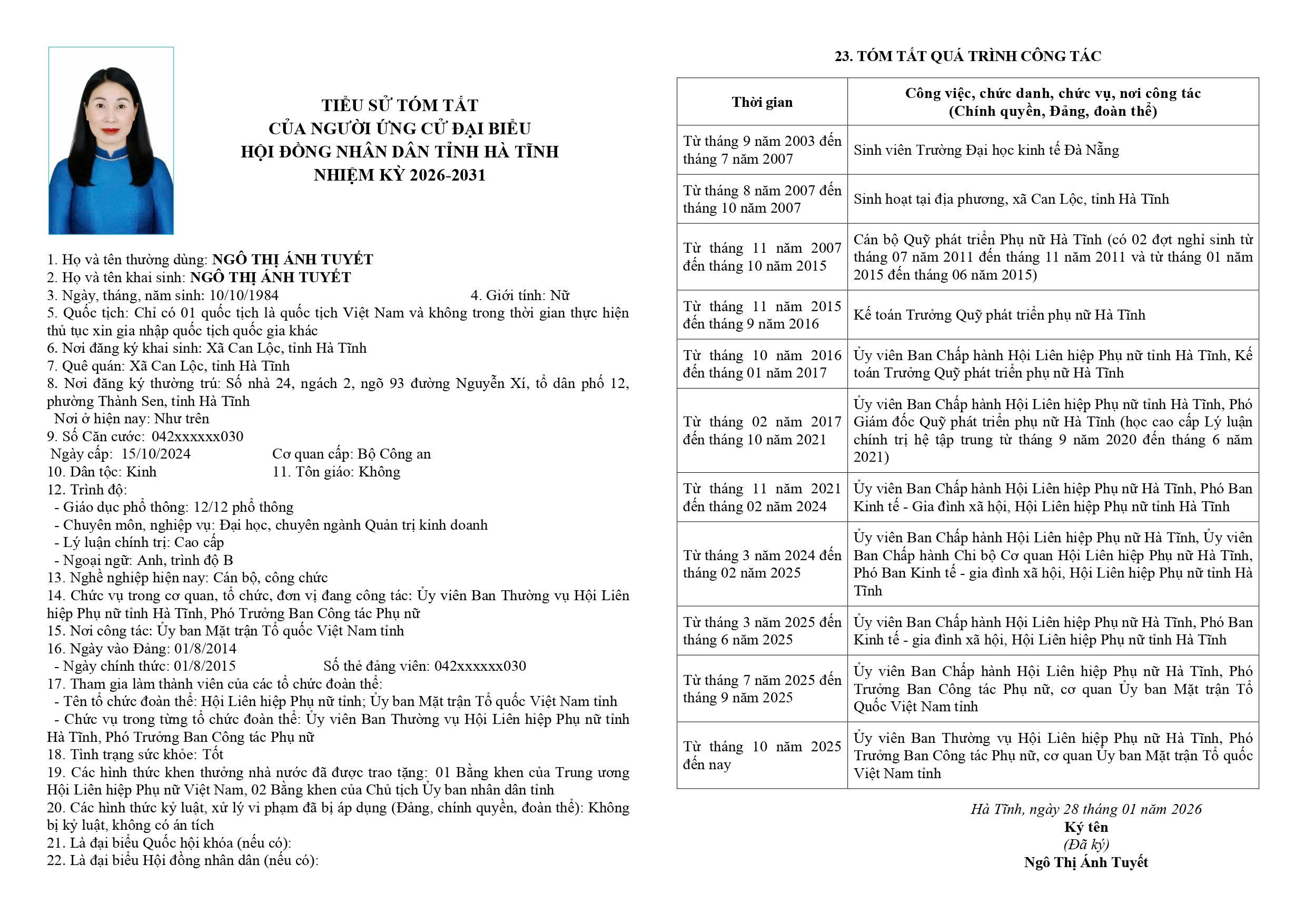 7. Ngô Thị Ánh Tuyết - Ủy viên Ban Thường vụ Hội Liên hiệp Phụ nữ Hà Tĩnh, Phó Trưởng Ban Công tác Phụ nữ, cơ quan Ủy ban Mặt trận Tổ quốc Việt Nam tỉnh