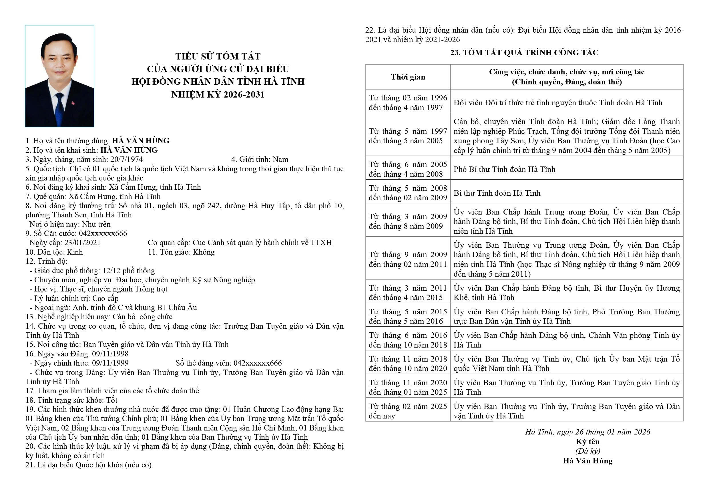 Danh sách chính thức người ứng cử đại biểu HĐND tỉnh khoá XIX tại Hà Tĩnh (Đơn vị bầu cử số 9)