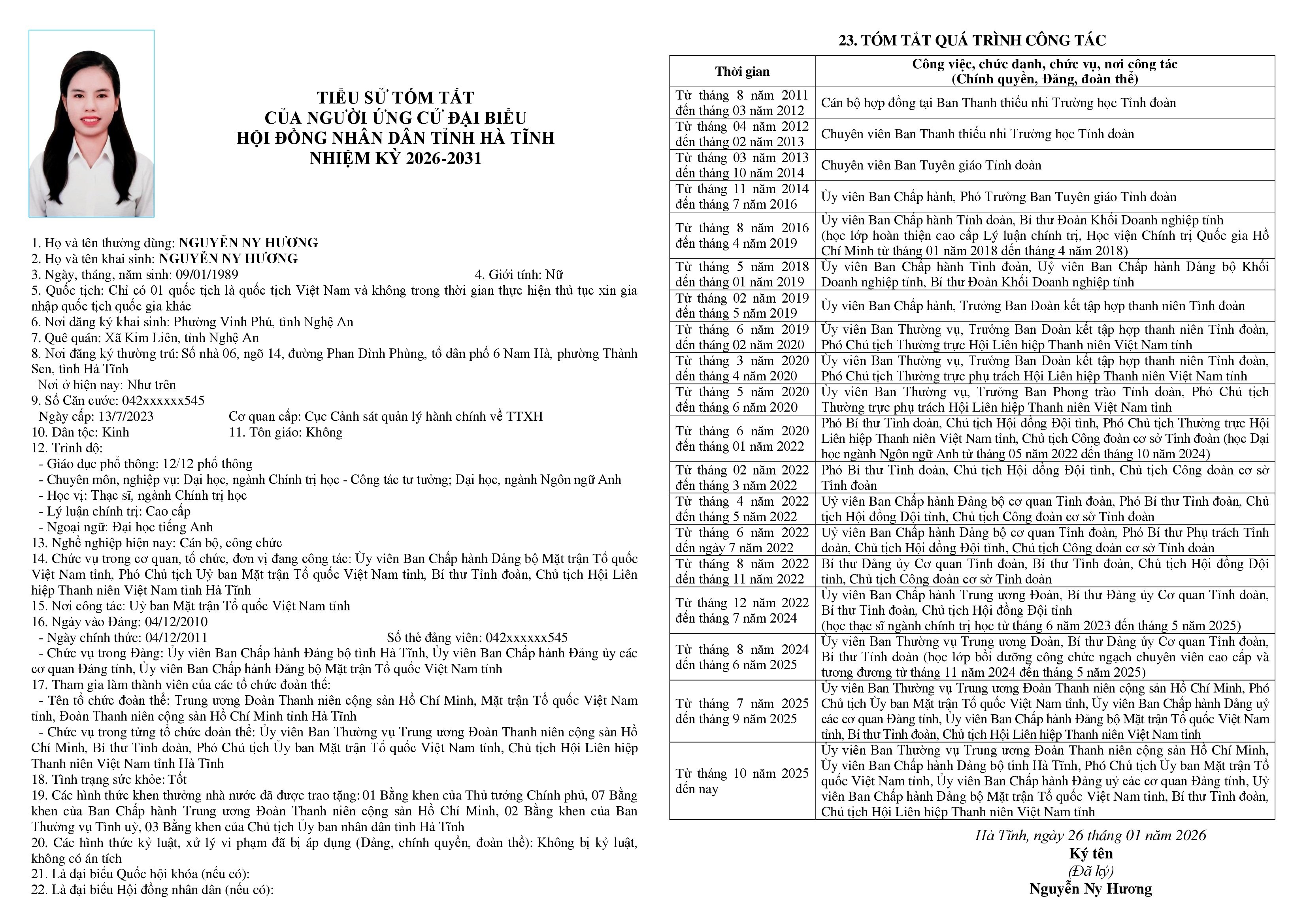 2. Bà Nguyễn Ny Hương – Ủy viên Ban Thường vụ Trung ương Đoàn TNCS Hồ Chí Minh; Ủy viên Ban Chấp hành Đảng bộ tỉnh; Ủy viên Ban Chấp hành Đảng ủy Các cơ quan Đảng tỉnh; Ủy viên Ban Chấp hành Đảng bộ Mặt trận Tổ quốc Việt Nam tỉnh; Phó Chủ tịch Ủy ban Mặt trận Tổ quốc Việt Nam tỉnh; Bí thư Tỉnh đoàn, Chủ tịch Hội Liên hiệp Thanh niên Việt Nam tỉnh Hà Tĩnh.