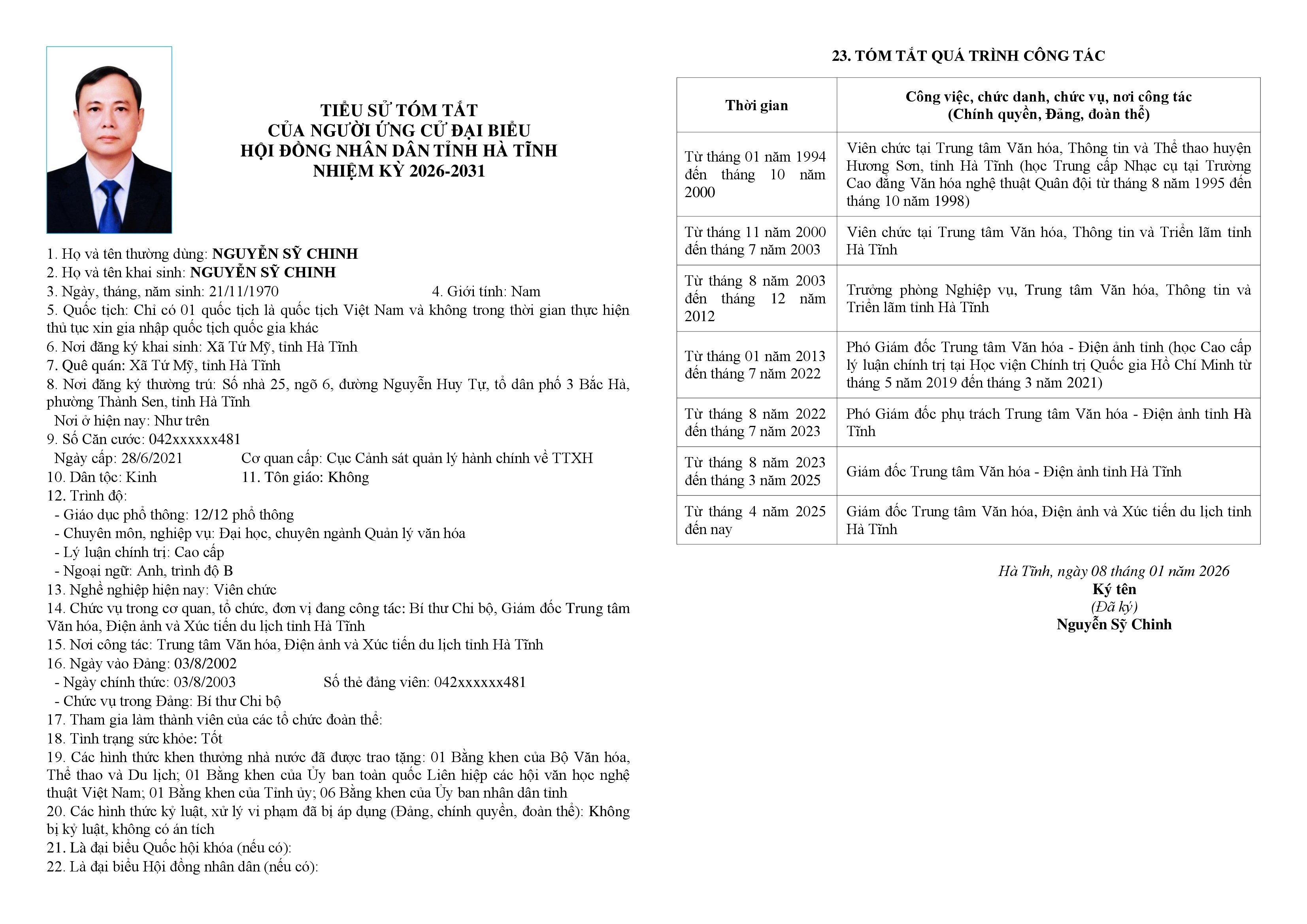 1.Ông Nguyễn Sỹ Chinh – Bí thư Chi bộ, Giám đốc Trung tâm Văn hóa, Điện ảnh và Xúc tiến Du lịch tỉnh Hà Tĩnh.
