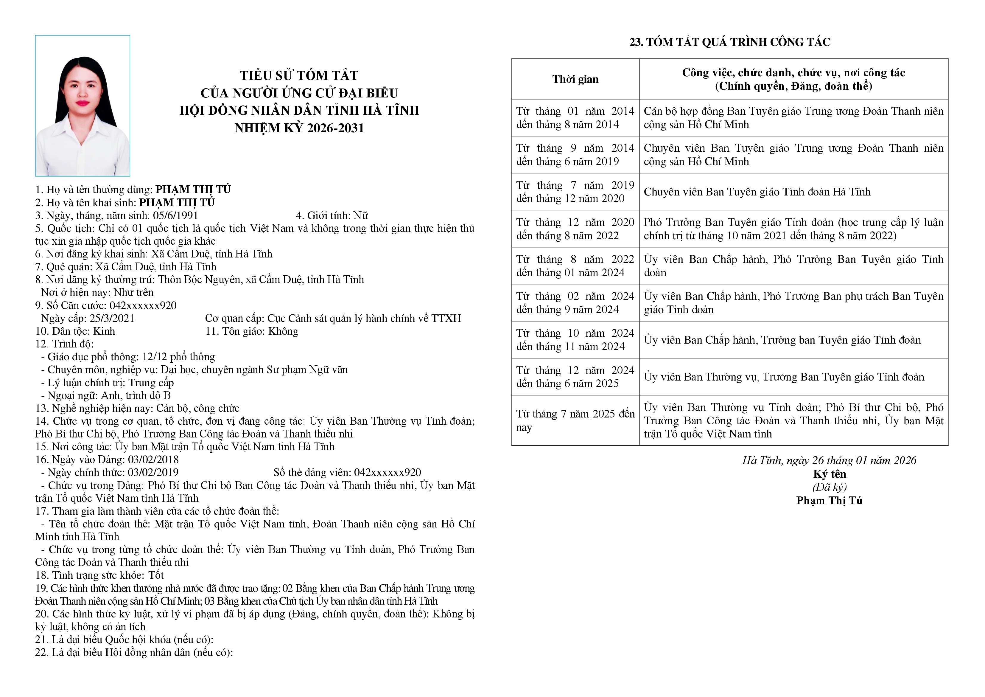 7. Phạm Thị Tú – Ủy viên Ban Thường vụ Tỉnh đoàn; Phó Bí thư Chi bộ, Phó Trưởng Ban Công tác Đoàn và Thanh thiếu nhi, Ủy ban Mặt trận Tổ quốc Việt Nam tỉnh Hà Tĩnh.