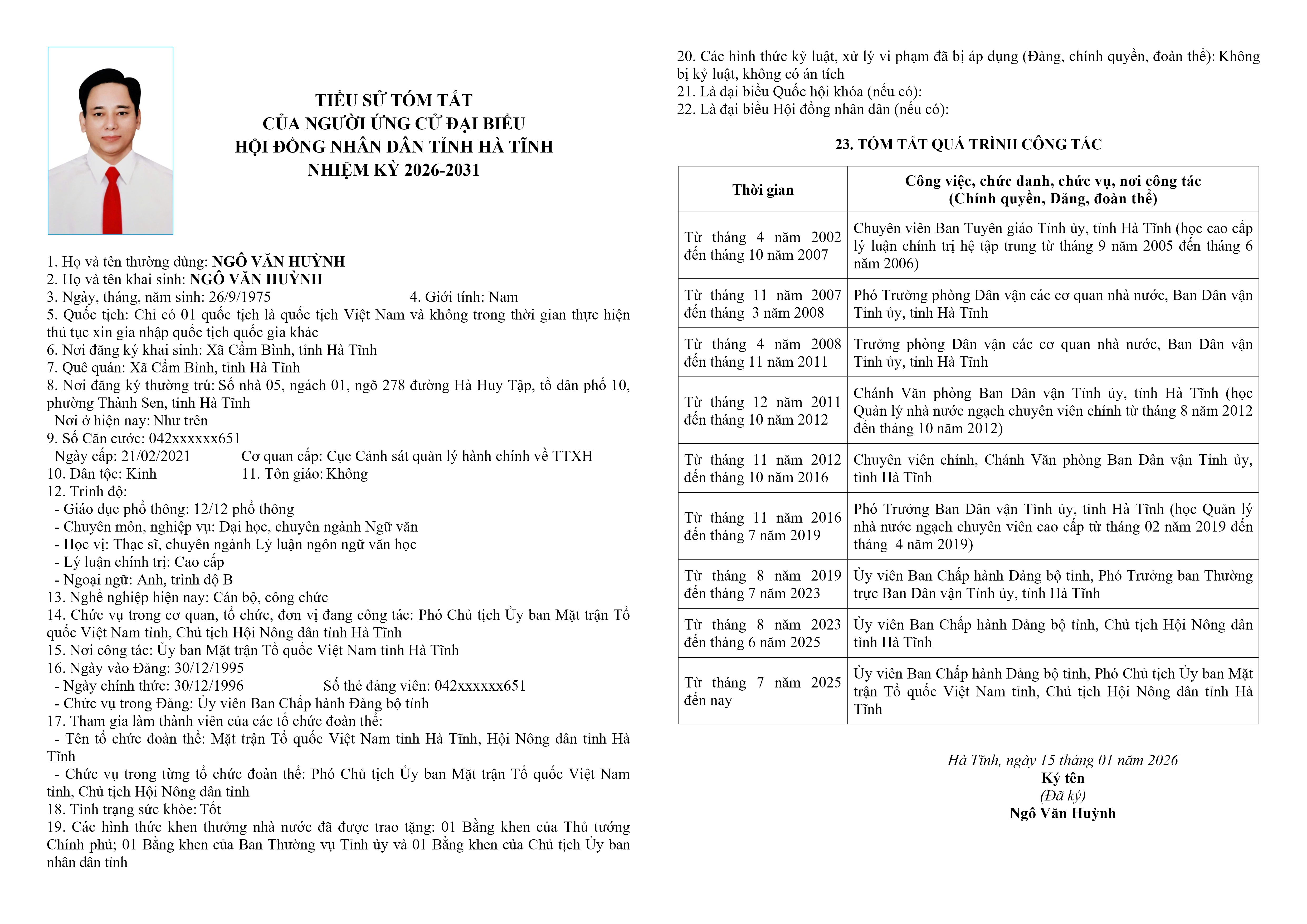 7. Ông Ngô Văn Huỳnh – Ủy viên Ban Chấp hành Đảng bộ tỉnh; Phó Chủ tịch Ủy ban Mặt trận Tổ quốc Việt Nam tỉnh; Chủ tịch Hội Nông dân tỉnh Hà Tĩnh.