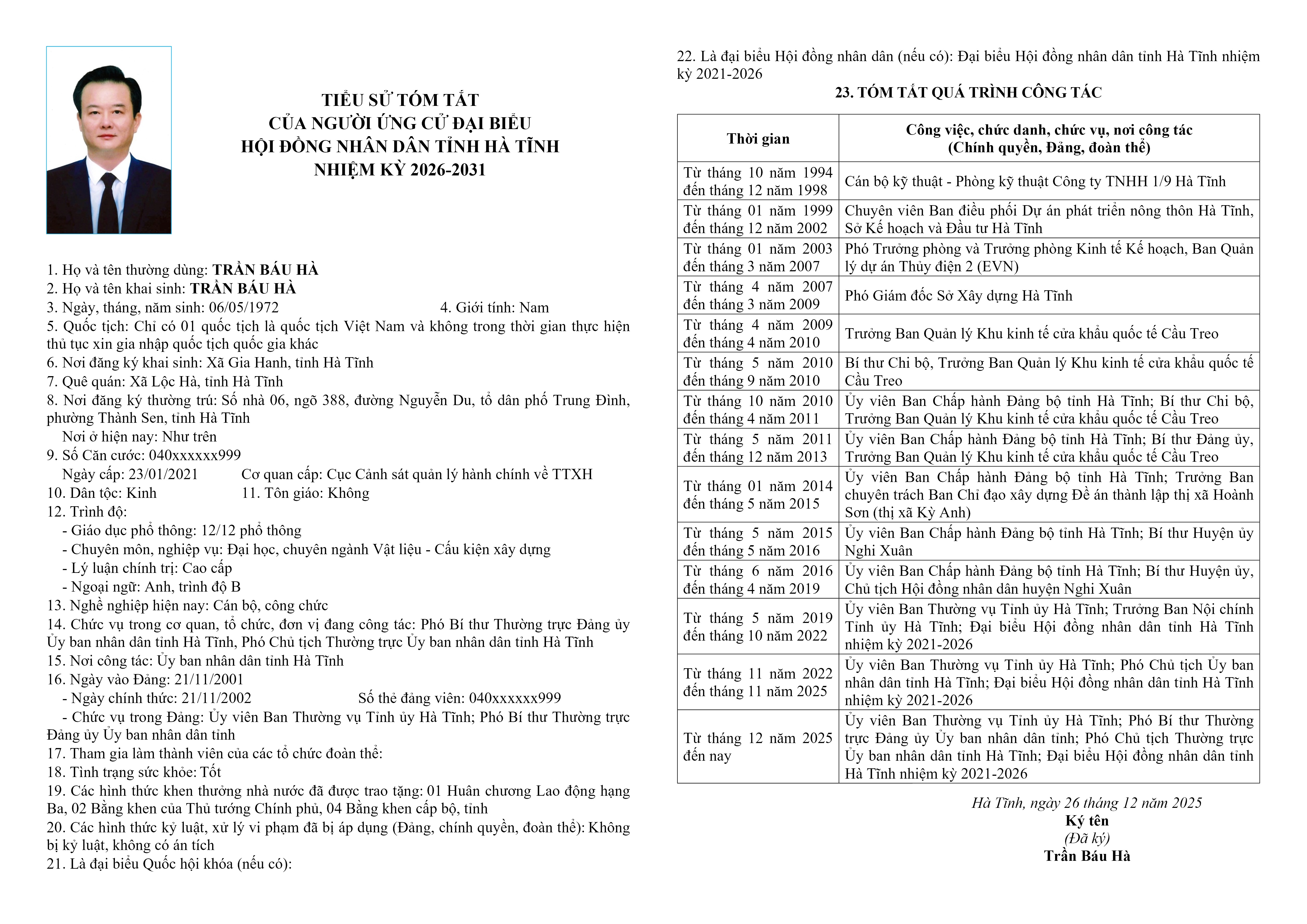 Danh sách chính thức người ứng cử đại biểu Hội đồng nhân dân tỉnh Hà Tĩnh khóa XIX, nhiệm kỳ 2026–2031, đơn vị bầu cử số 12