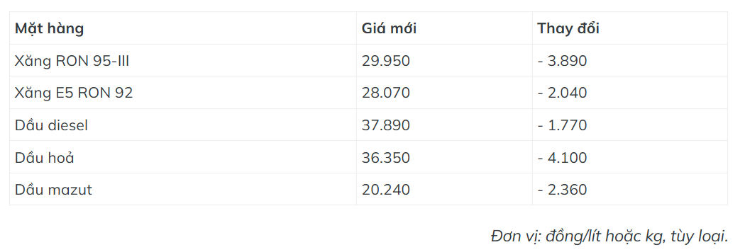 Theo điều chỉnh của Liên bộ Công Thương - Tài chính, giá xăng RON 95-III (loại phổ biến trên thị trường) giảm 3.890 đồng, xuống 29.950 đồng một lít. Tương tự, E5 RON 92 hạ 2.040 đồng, có giá mới 28.070 đồng.