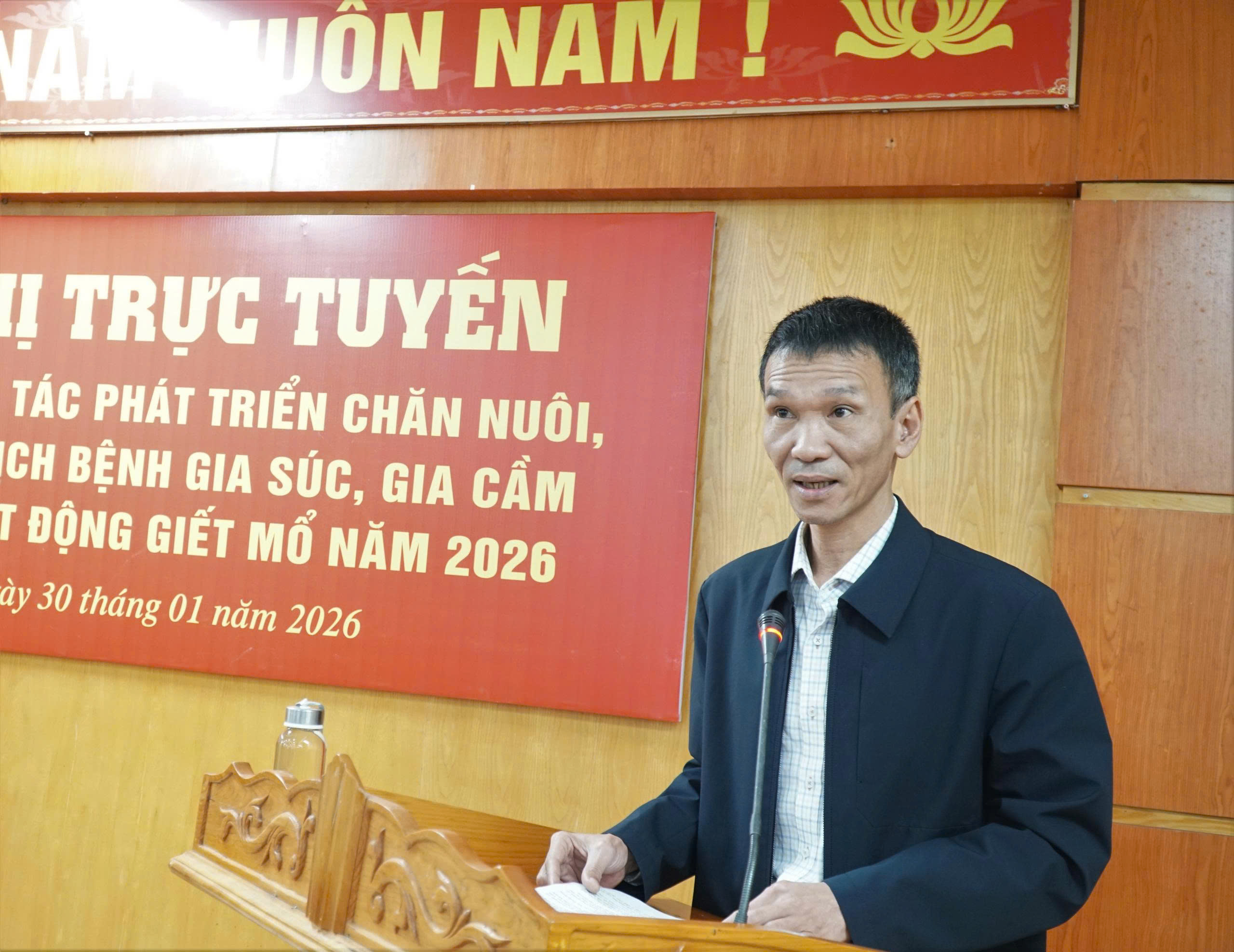 Ông Trần Hùng - Chi cục trưởng Chi cục Trồng trọt và Chăn nuôi báo cáo công tác phát triển chăn nuôi, phòng chống dịch bệnh gia súc, gia cầm và quản lý hoạt động giết mổ năm 2025, định hướng 2026