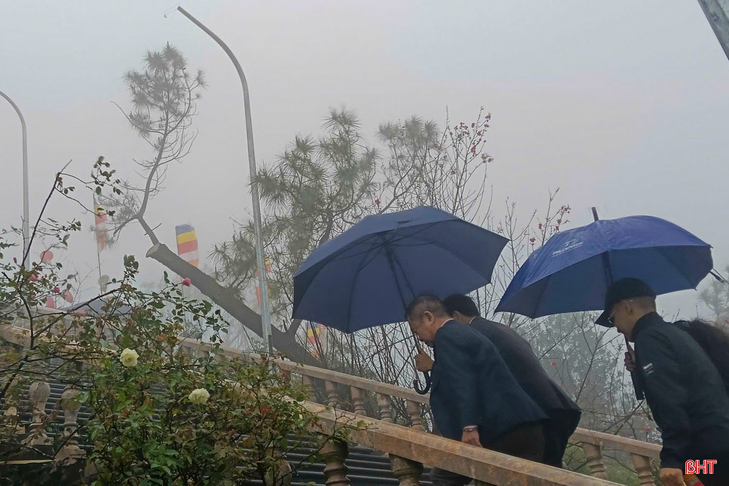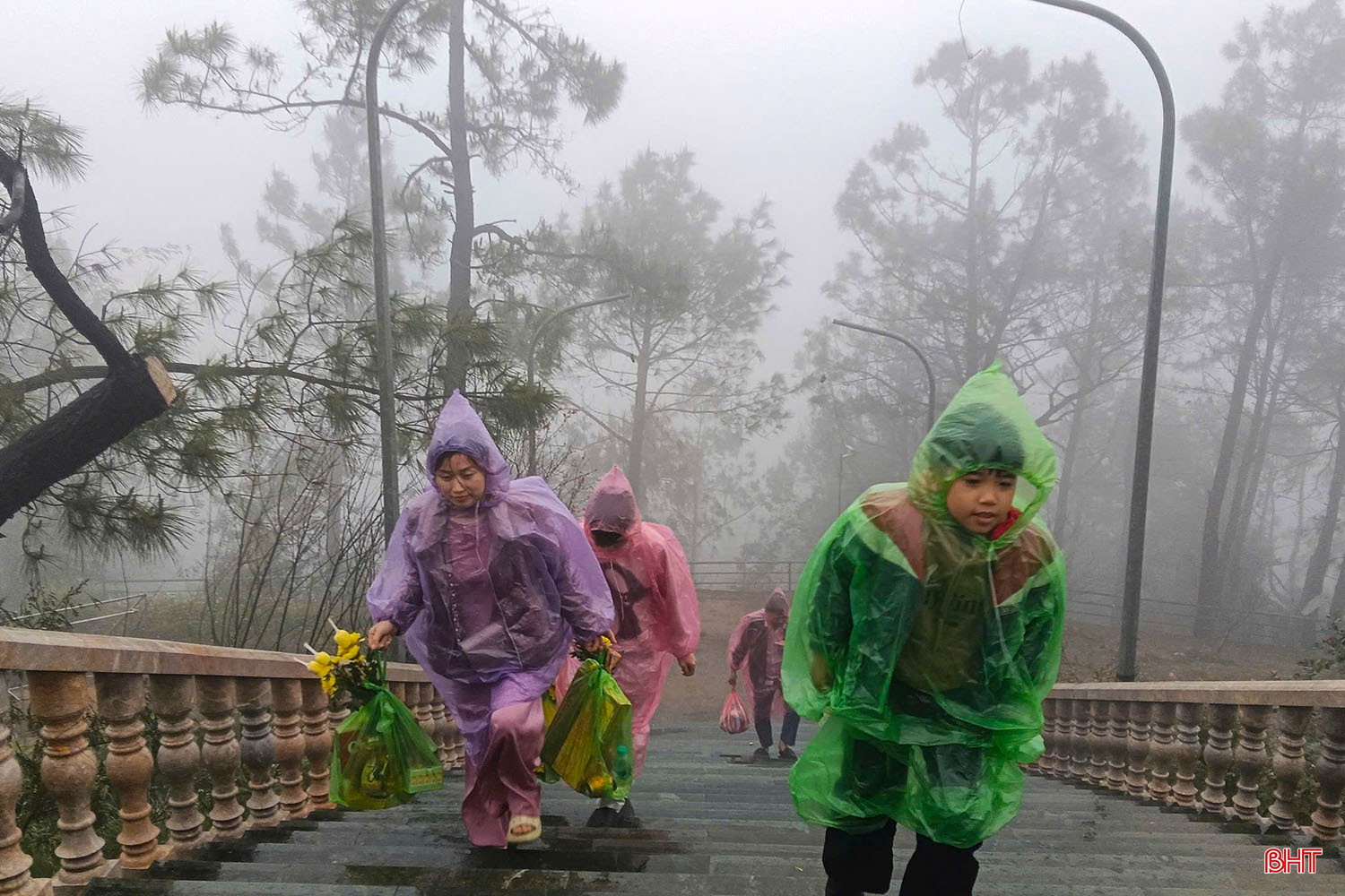Với độ cao gần 600m so với mực nước biển, thời tiết ở chùa Hương Tích sáng mồng 2 Tết mưa nặng hạt hơn dưới chân núi...