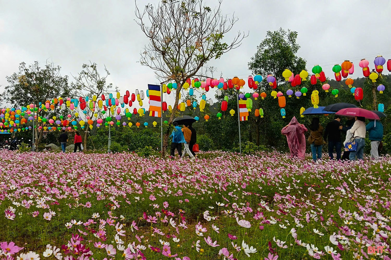 Từ cổng vào khu du lịch, hai bên đường sắc hoa tràn ngập...