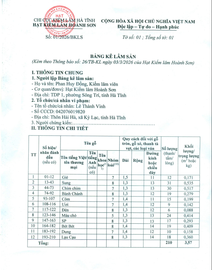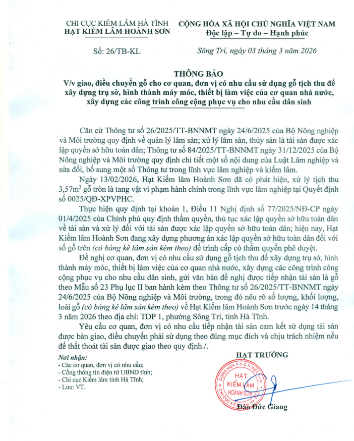 Ngày 03/03/2026, Hạt Kiểm lâm Hoành Sơn có Thông báo số 26/TB-KL về việc giao, điều chuyển gỗ cho cơ quan, đơn vị có nhu cầu sử dụng gỗ tịch thu để xây dựng trụ sở, hình thành máy móc, thiết bị làm việc của cơ quan Nhà nước, xây dựng công trình công cộng phục vụ nhu cầu dân sinh.