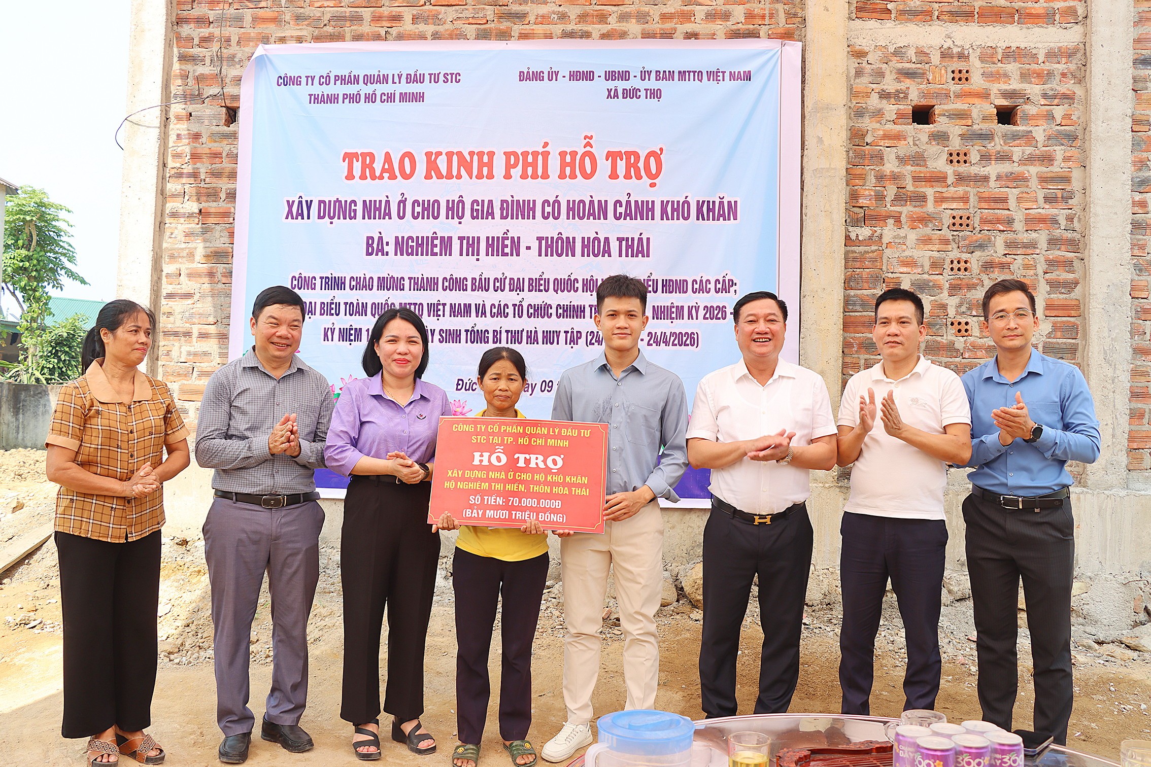 Sáng 9/4, Ủy ban MTTQ xã Đức Thọ phối hợp với Công ty CP Quản lý đầu tư STC Thành phố Hồ Chí Minh (đơn vị tài trợ) đã bàn giao 2 nhà tình nghĩa cho 2 hộ gia đình có hoàn cảnh đặc biệt khó khăn tại thôn Đồng Hòa và thôn Hòa Thái, xã Đức Thọ.
