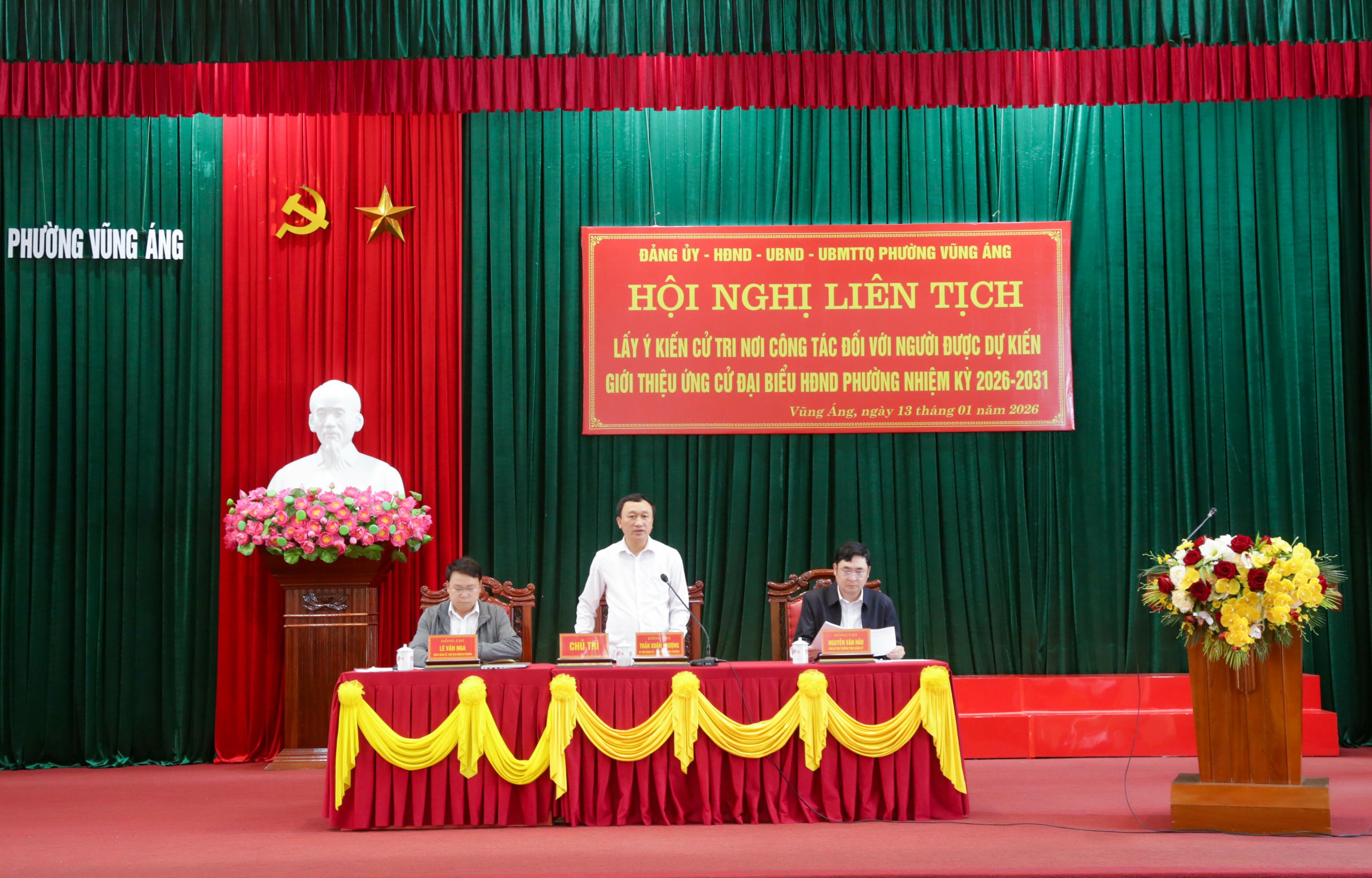 Chiều 13/1/2026, Đảng ủy, HĐND, UBND và Ủy ban MTTQ Việt Nam Phường Vũng Áng tổ chức Hội nghị liên tịch lấy ý kiến cử tri nơi công tác đối với người được dự kiến giới thiệu ứng cử đại biểu HĐND phường nhiệm kỳ 2026 – 2031. Hội nghị do các đồng chí Trần Xuân Phượng – Bí thư Đảng ủy, Chủ tịch HĐND phường; Nguyễn Văn Hảo – Phó Bí thư Thường trực Đảng ủy; Lê Văn Nga – Ủy viên Ban Thường vụ Đảng ủy, Chủ tịch Ủy ban MTTQ Việt Nam phường chủ trì.