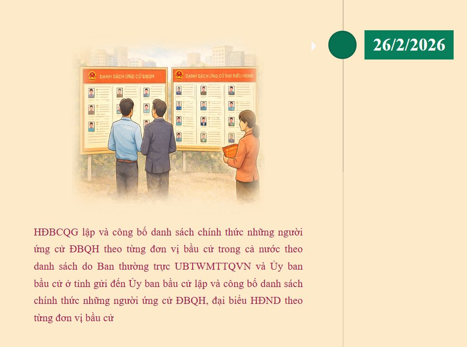 Cuộc bầu cử ĐBQH khóa XVI và đại biểu HĐND các cấp nhiệm kỳ 2026-2031 là sự kiện chính trị trọng đại của đất nước diễn ra ngay sau Đại hội lần thứ XIV của Đảng. Đây là đợt sinh hoạt dân chủ sâu rộng trong nhân dân nhằm phát huy quyền làm chủ, lựa chọn những người tiêu biểu, xứng đáng, đại diện cho ý chí, nguyện vọng và quyền làm chủ của nhân dân. Dưới đây là các mốc thời gian trước khi diễn ra cuộc bầu cử ĐBQH khóa XVI và đại biểu HĐND các cấp nhiệm kỳ 2026-2031.
