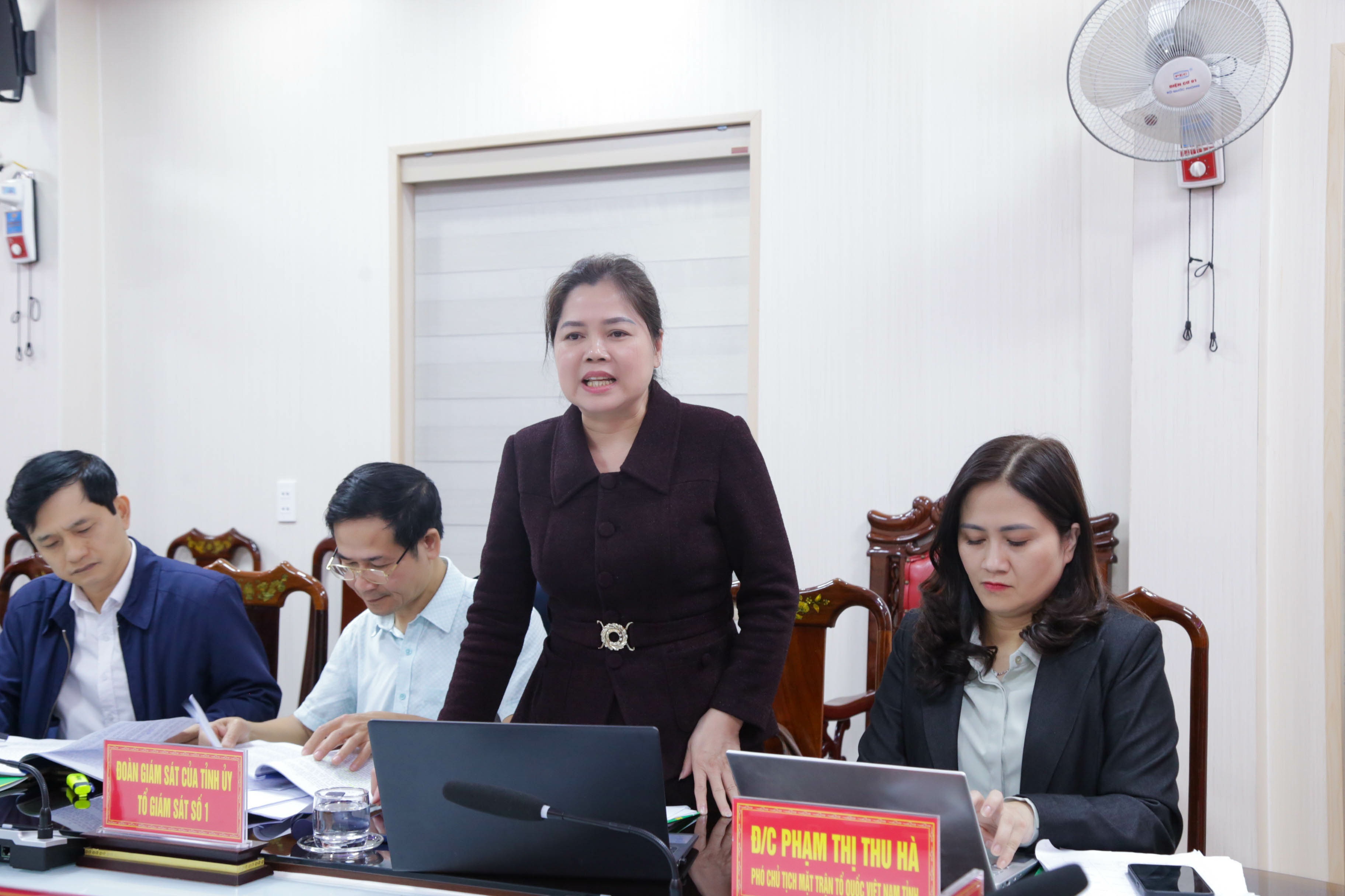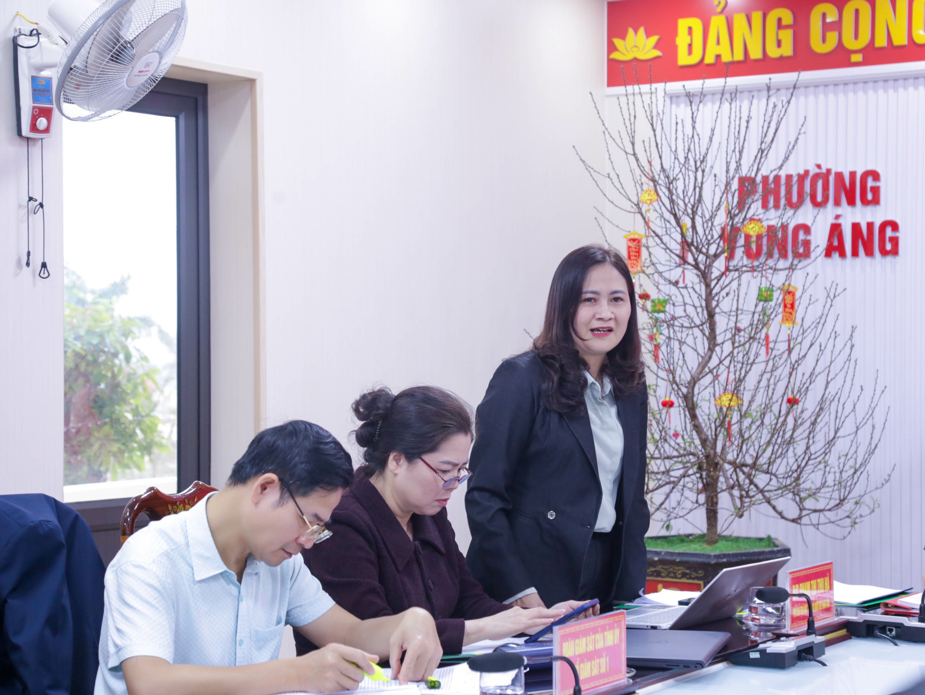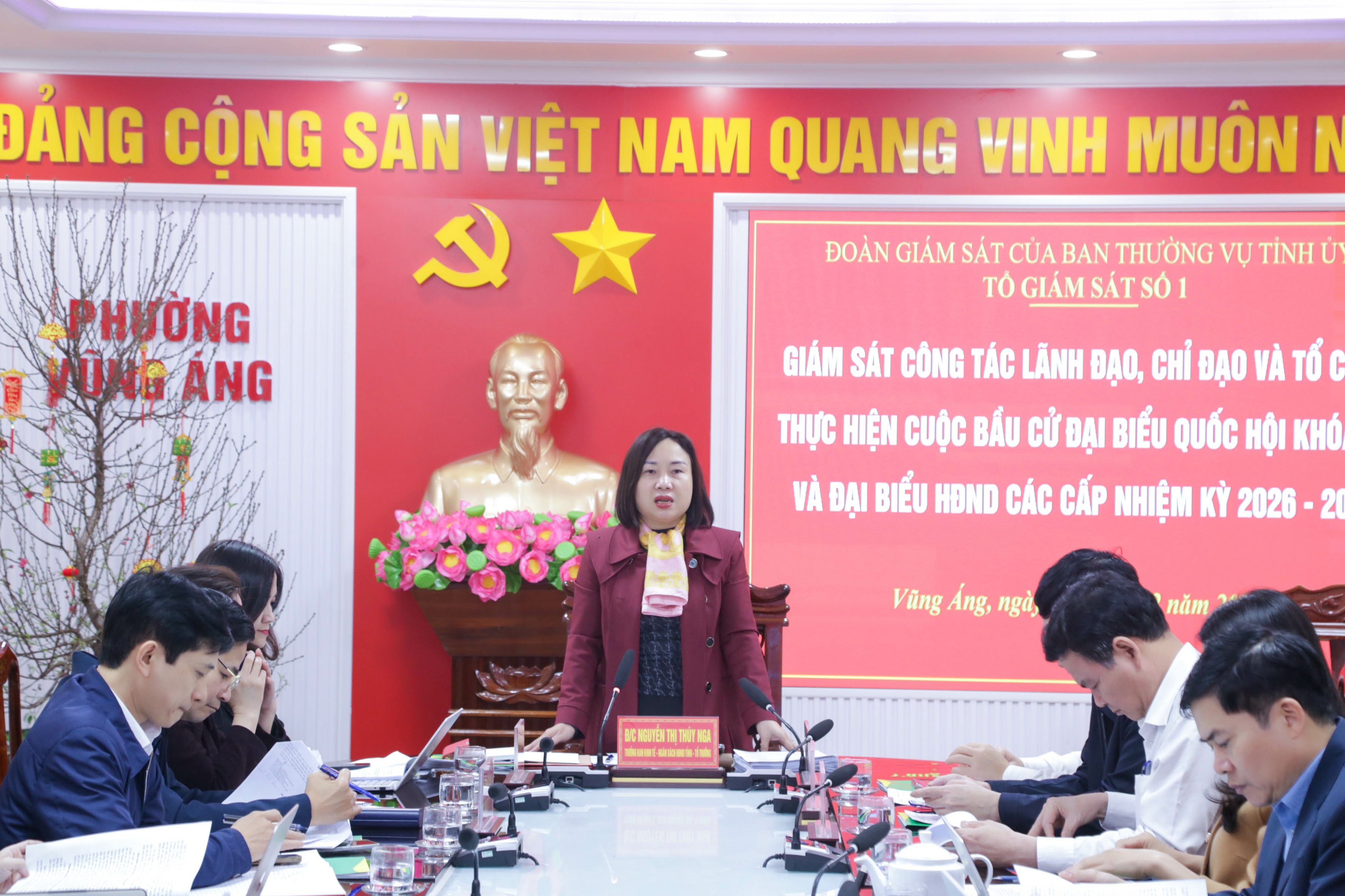 Đồng chí Nguyễn Thị Thúy Nga – Trưởng Ban Kinh tế - Ngân sách HĐND tỉnh Phó trưởng đoàn chủ trì cuộc làm việc. Tham dự buổi giám sát có các thành viên Tổ giám sát; đại diện lãnh đạo Ủy ban MTTQ tỉnh, Sở Nội vụ, UBKT, Văng phòng Tỉnh ủy; về phía phường Vũng Áng có đồng chí Trần Xuân Phượng Bí thư Đảng ủy - Chủ tịch HĐND phường - Trưởng Ban chỉ đạo bầu cử phường; lãnh đạo HĐND, UBND, Ủy ban MTTQ phường và đại diện các cơ quan, đơn vị liên quan.