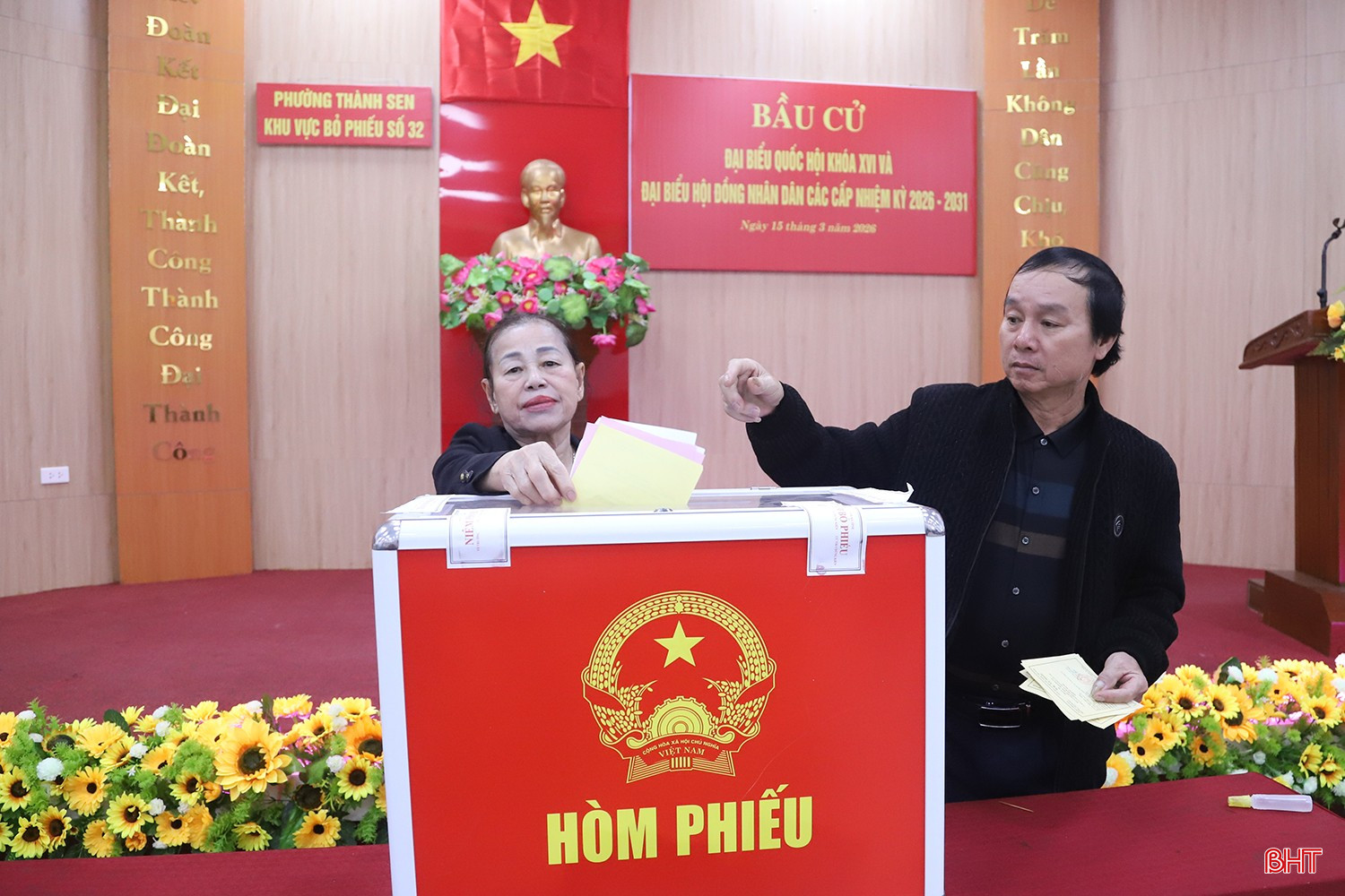 Những tuyến đường ở đô thị trung tâm phường Thành Sen rực rỡ cờ hoa, băng rôn, biểu ngữ. Tiếng nhạc vang lên rộn ràng, tạo nên không khí náo nức, như thôi thúc bước chân cử tri đến với các điểm bỏ phiếu đã được chuẩn bị chu đáo.