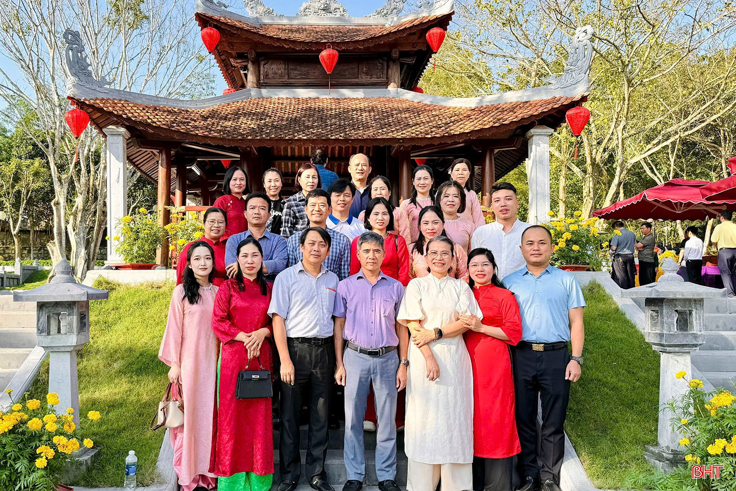 Bác sĩ Nguyễn Thế Phiệt (hàng đầu thứ 4 từ trái sang) cùng cán bộ, nhân viên Trung tâm Y tế Thạch Hà chụp ảnh lưu niệm sau khi dâng hương mộ Đại danh y Lê Hữu Trác.