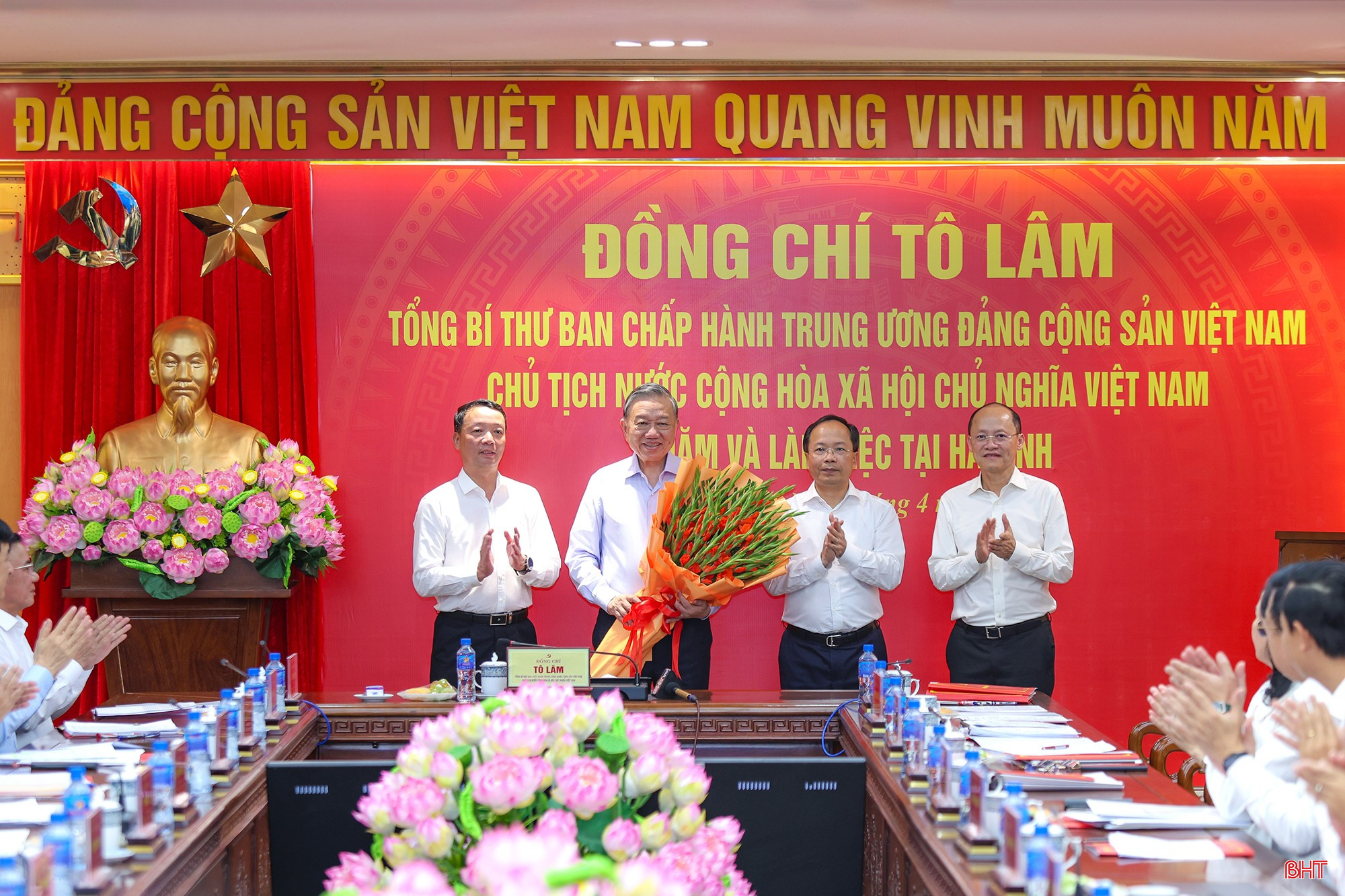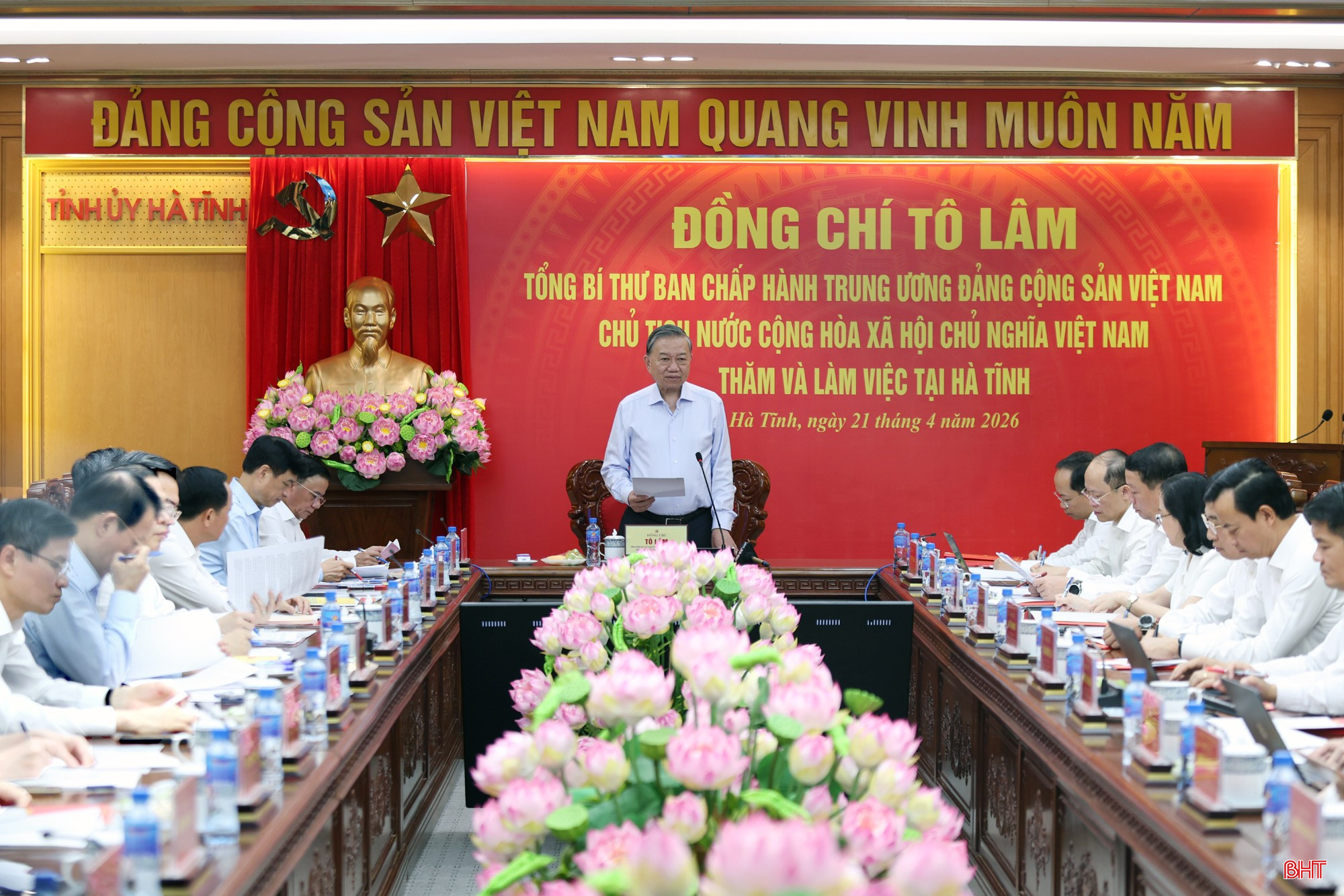 Tiếp tục chương trình công tác tại Hà Tĩnh, chiều 21/4, đồng chí Tô Lâm - Tổng Bí thư, Chủ tịch nước đã có buổi làm việc với Ban Thường vụ Tỉnh ủy Hà Tĩnh về tình hình, kết quả triển khai thực hiện Nghị quyết Đại hội XIV của Đảng, Nghị quyết Đại hội Đảng bộ tỉnh lần thứ XX; các chủ trương, nghị quyết chiến lược của Trung ương và định hướng nhiệm vụ, chiến lược phát triển tỉnh Hà Tĩnh trong thời gian tới.