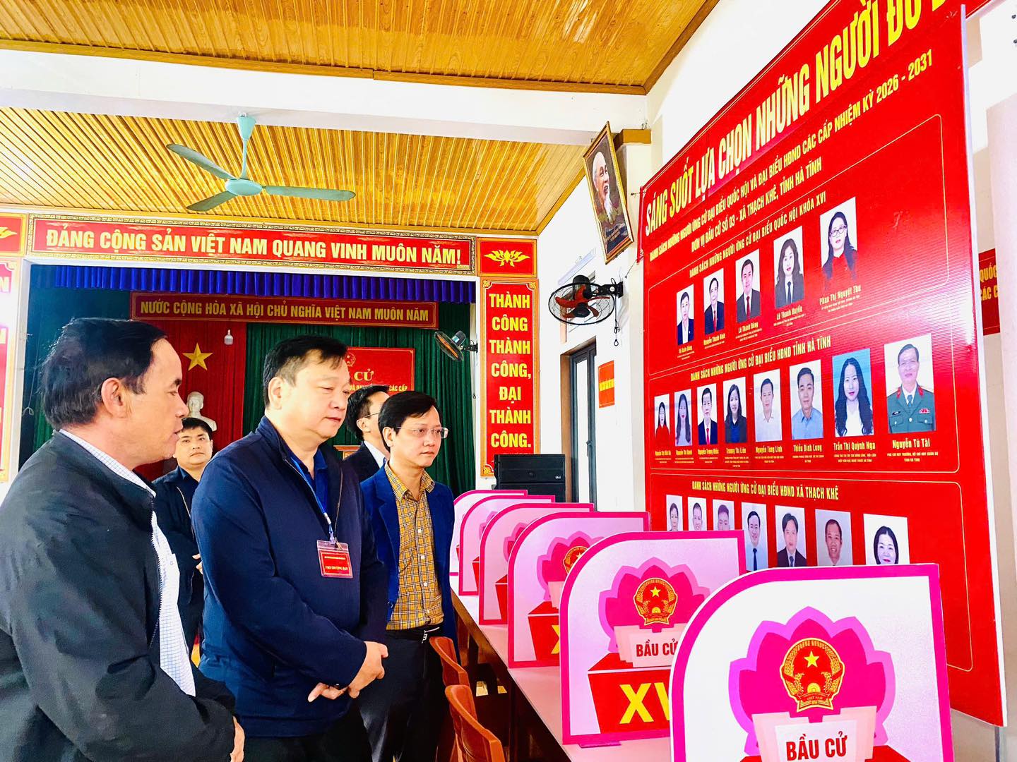 Tại buổi làm việc, đoàn công tác đã trực tiếp kiểm tra thực tế tại một số khu vực bỏ phiếu trên địa bàn xã nhằm nắm bắt tiến độ chuẩn bị cho cuộc bầu cử đại biểu Quốc hội khóa XVI và đại biểu HĐND các cấp nhiệm kỳ 2026 – 2031. Nội dung kiểm tra tập trung vào việc chuẩn bị cơ sở vật chất, công tác niêm yết danh sách cử tri, danh sách và tiểu sử tóm tắt của các ứng cử viên, cũng như việc trang trí khu vực bỏ phiếu và các điều kiện phục vụ cử tri trong ngày bầu cử.