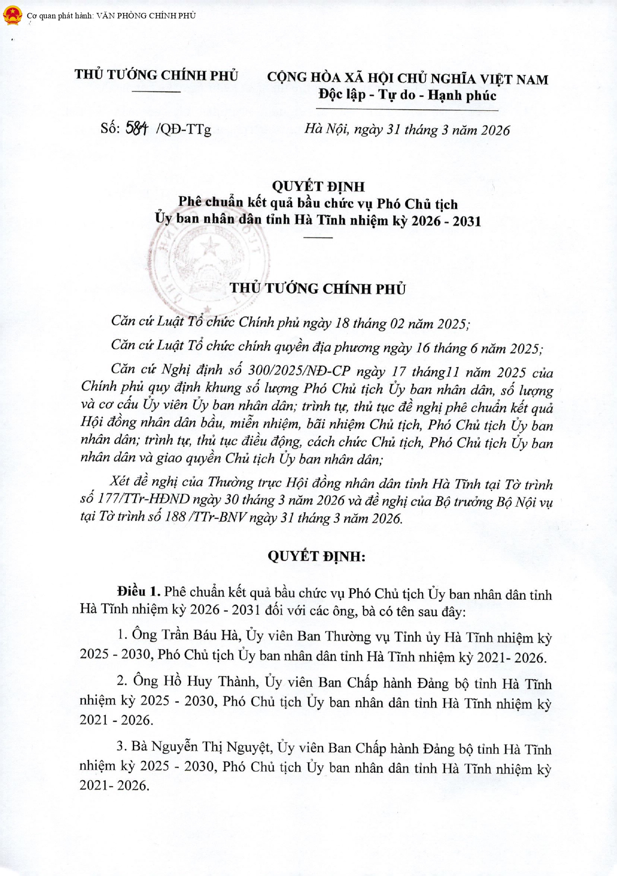 Tại Quyết định số 584/QĐ-TTg ngày 31/3/2026, Phó Thủ tướng Nguyễn Hòa Bình phê chuẩn kết quả bầu chức vụ Phó Chủ tịch Ủy ban nhân dân tỉnh Hà Tĩnh nhiệm kỳ 2026 - 2031 đối với ông Trần Báu Hà, Ủy viên Ban Thường vụ Tinh ủy Hà Tĩnh nhiệm kỳ 2025 - 2030, Phó Chủ tịch Uy ban nhân dân tỉnh Hà Tĩnh nhiệm kỳ 2021- 2026; ông Hồ Huy Thành, Ủy viên Ban Chấp hành Đảng bộ tỉnh Hà Tĩnh