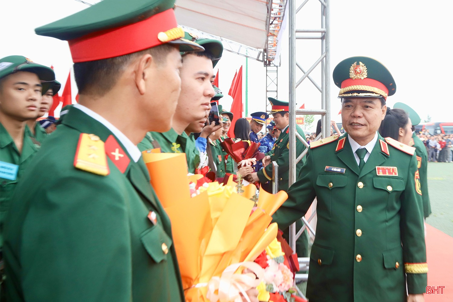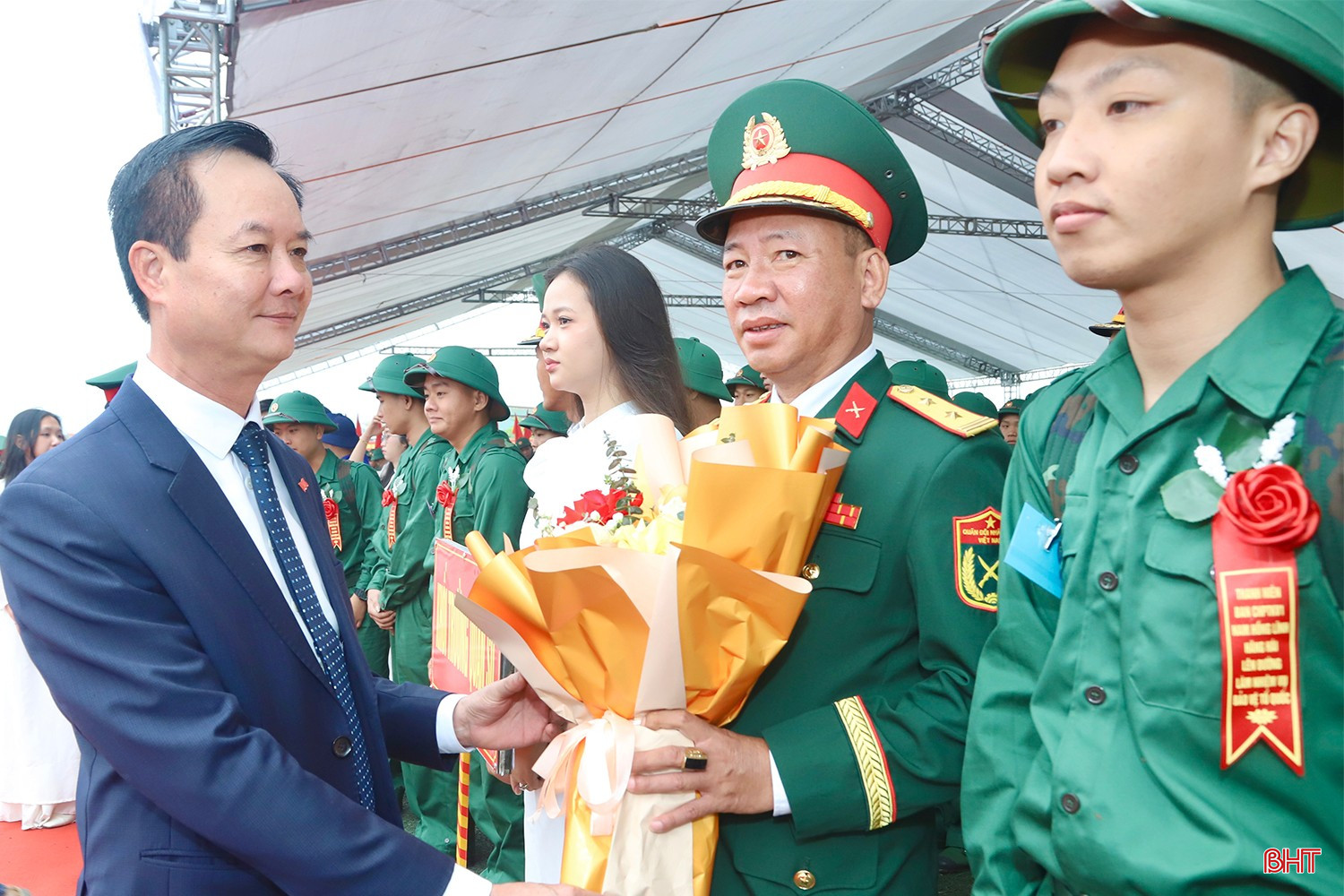 Sau phần nghi thức, Thiếu tướng Lê Hồng Nhân - Phó Tư lệnh, Tham mưu trưởng Quân khu 4, Bí thư Tỉnh ủy Nguyễn Duy Lâm và các đồng chí lãnh đạo tỉnh đã tặng hoa, tặng quà chúc mừng và động viên các chiến sĩ yên tâm lên đường nhập ngũ.