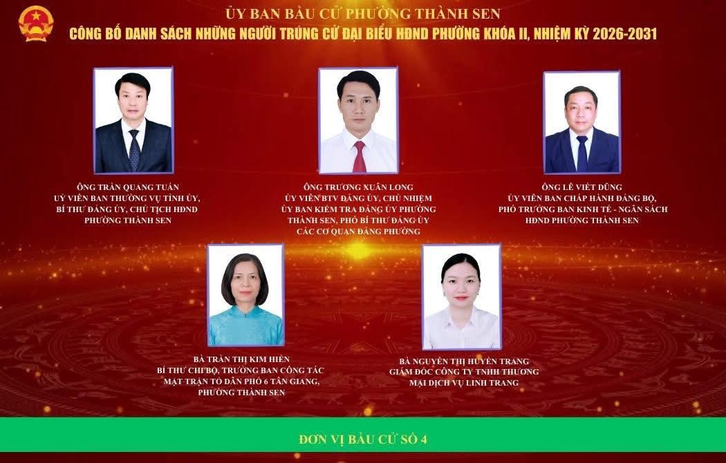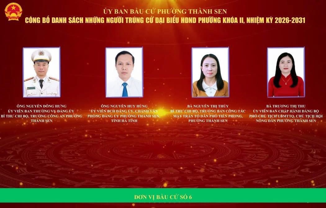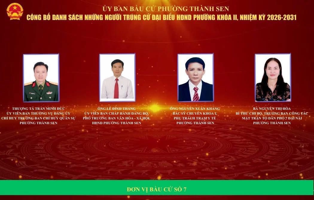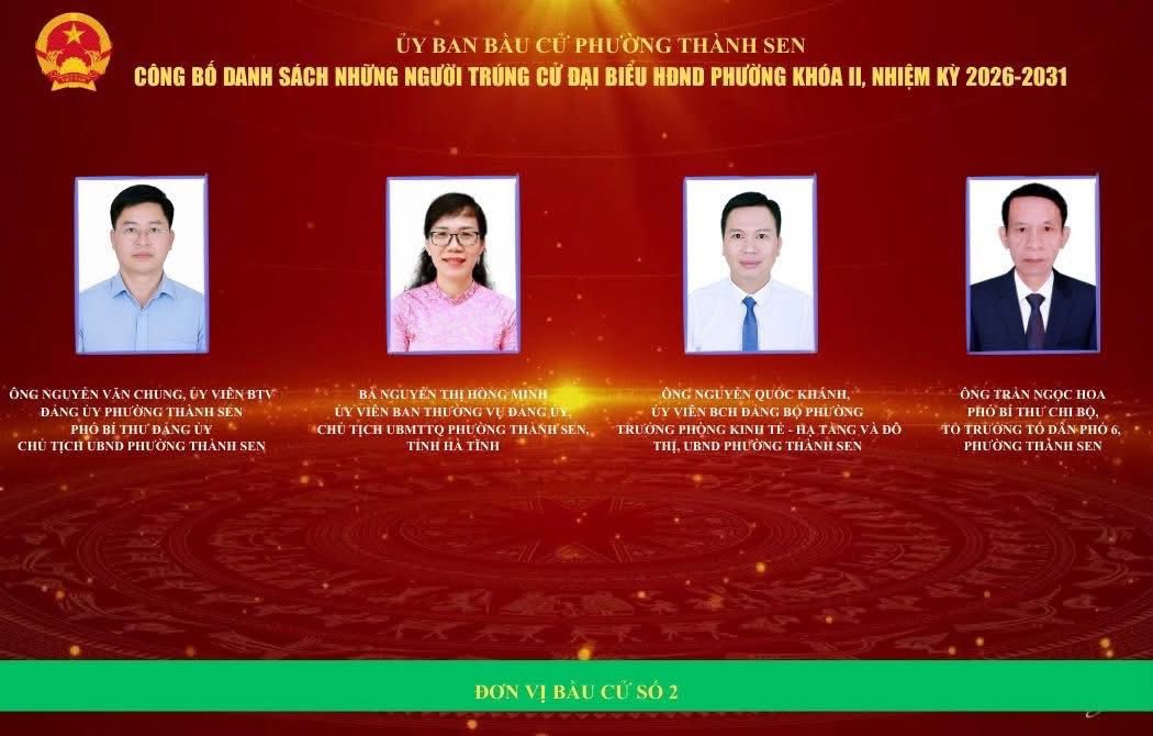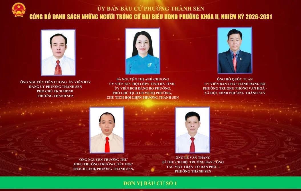 Ủy ban bầu cử phường Thành Sen vừa chính thức công bố kết quả cuộc bầu cử đại biểu Hội đồng nhân dân (HĐND) phường khóa II, nhiệm kỳ 2026 – 2031. Theo đó, căn cứ kết quả kiểm phiếu và xác nhận hợp lệ, 30 đại biểu đã trúng cử vào HĐND phường khóa II.