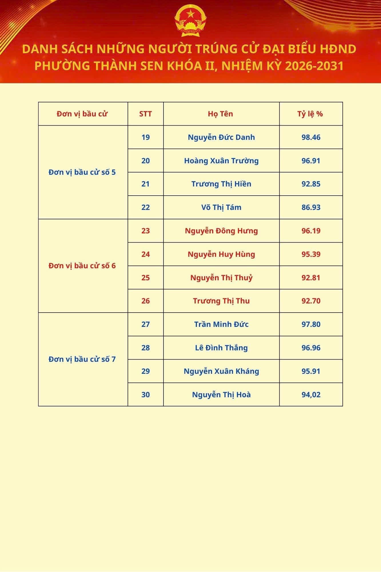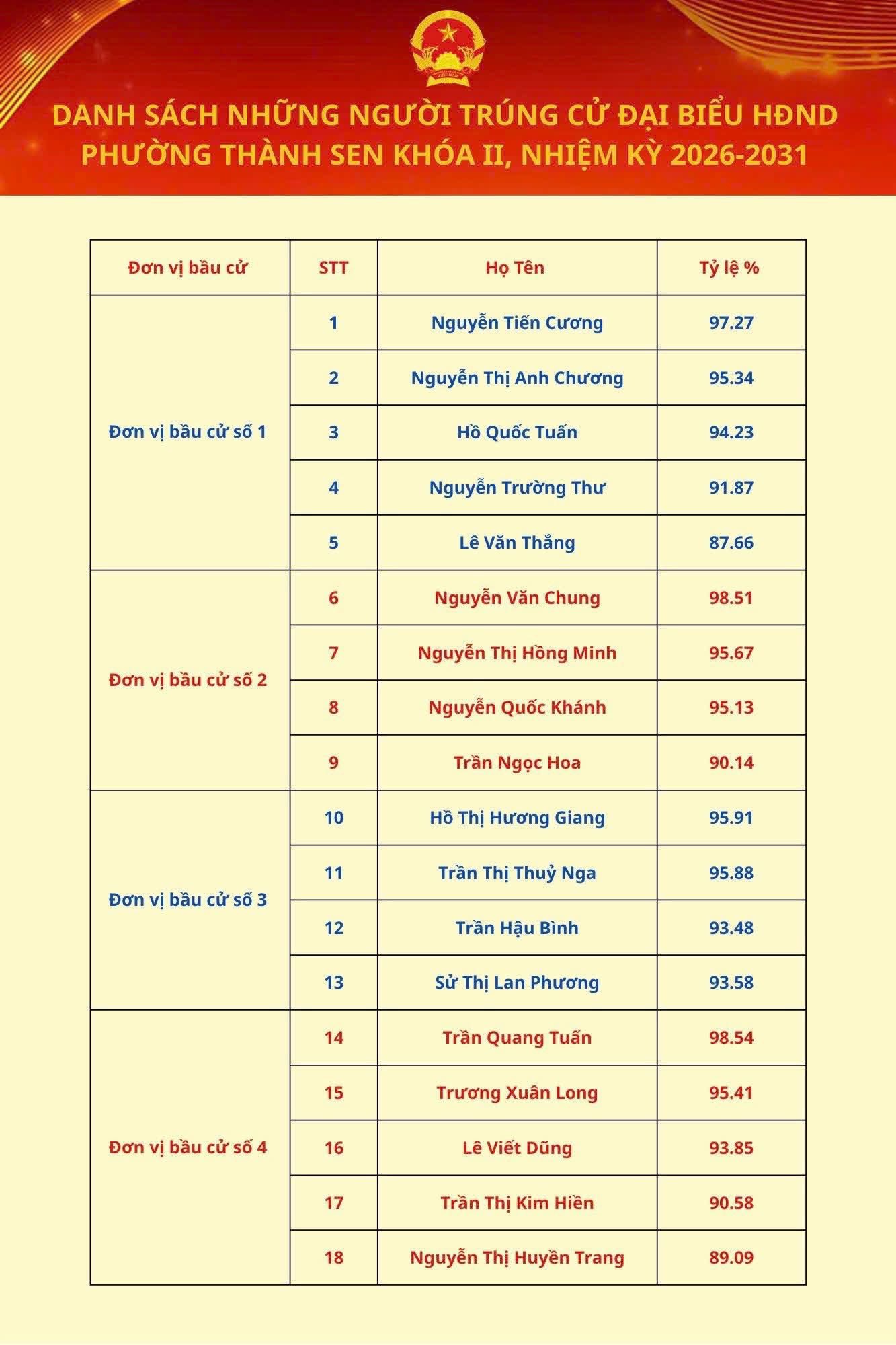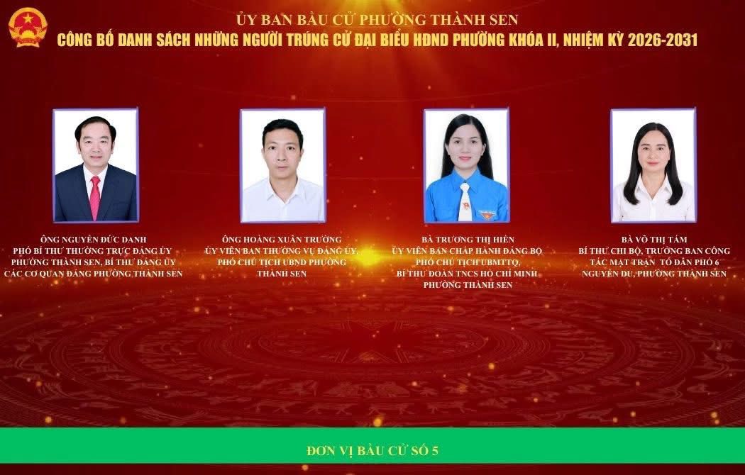 Ủy ban bầu cử phường Thành Sen vừa chính thức công bố kết quả cuộc bầu cử đại biểu Hội đồng nhân dân (HĐND) phường khóa II, nhiệm kỳ 2026 – 2031. Theo đó, căn cứ kết quả kiểm phiếu và xác nhận hợp lệ, 30 đại biểu đã trúng cử vào HĐND phường khóa II.