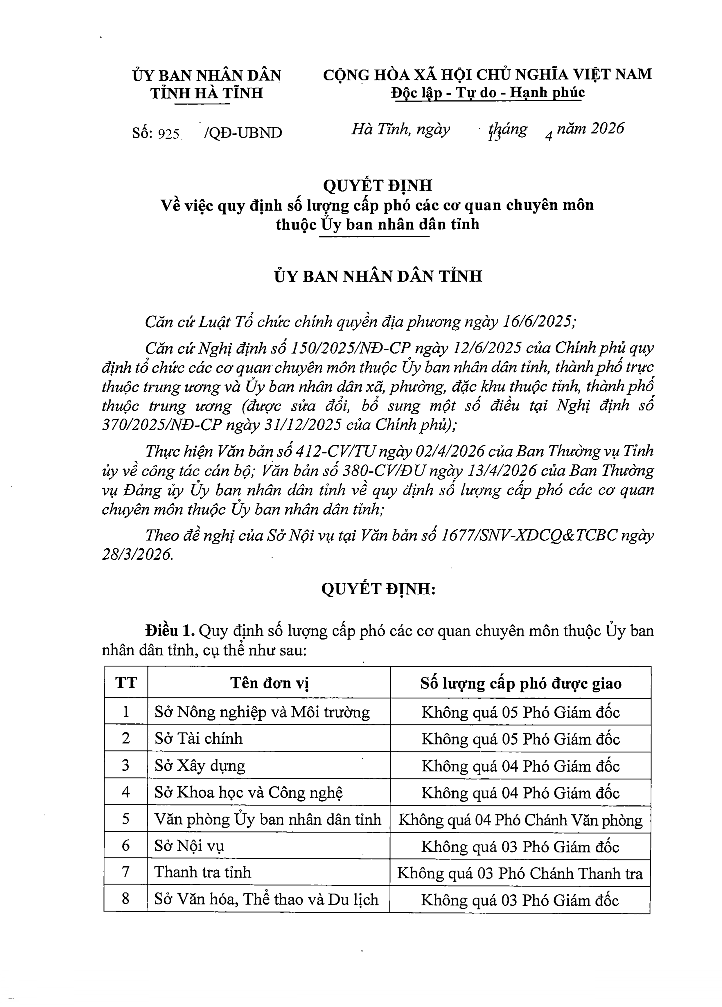 Ủy ban nhân dân tỉnh Hà Tĩnh vừa ban hành Quyết định số 925/QĐ-UBND ngày 13/4/2026 quy định số lượng cấp phó tại các cơ quan chuyên môn trực thuộc, nhằm kiện toàn tổ chức bộ máy, nâng cao hiệu lực, hiệu quả hoạt động của chính quyền địa phương.