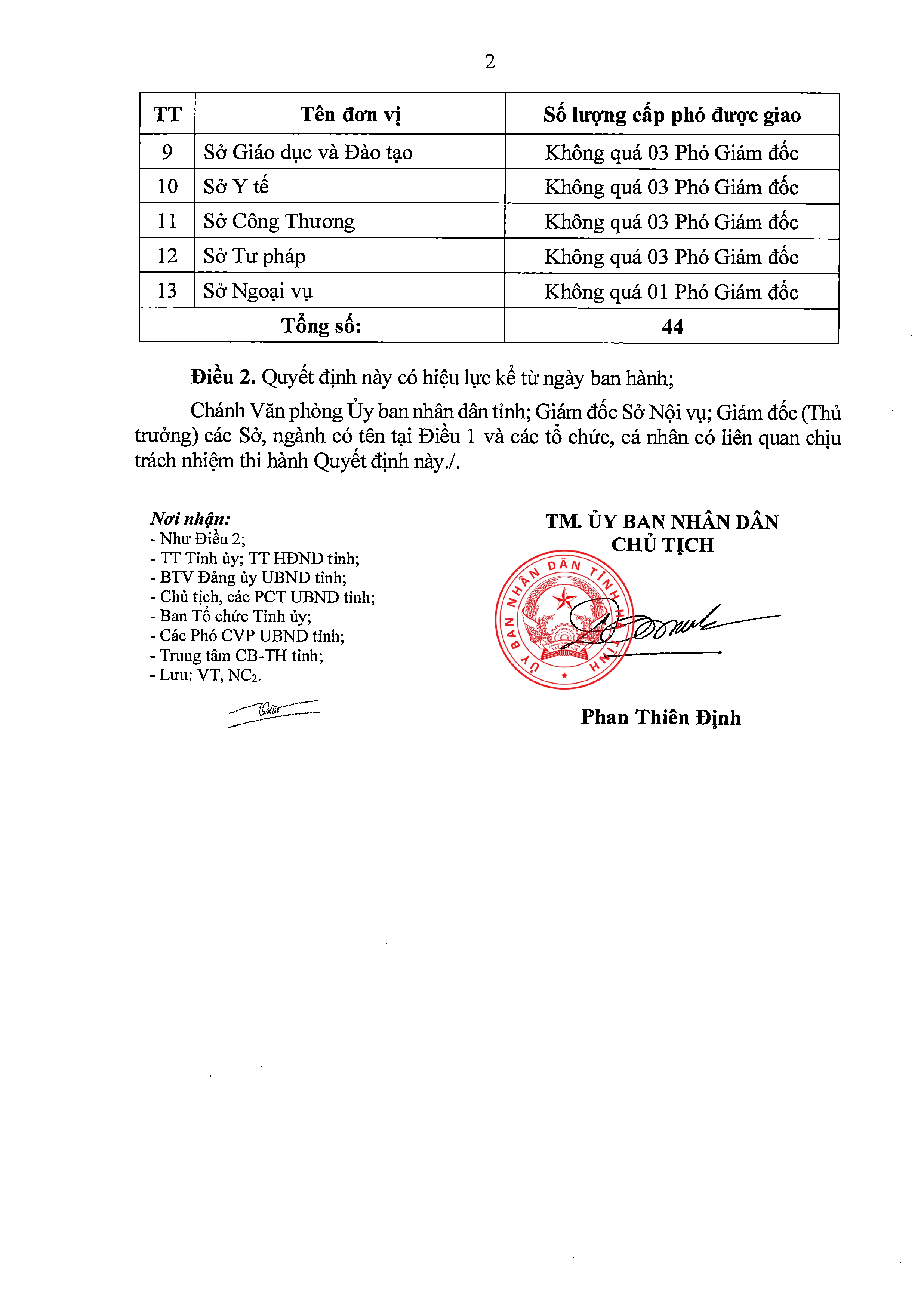 Theo quy định mới, tổng số cấp phó được bố trí tại 13 cơ quan chuyên môn thuộc UBND tỉnh là 44 người. Việc phân bổ số lượng cấp phó được xác định theo quy mô, tính chất và khối lượng công việc của từng đơn vị.