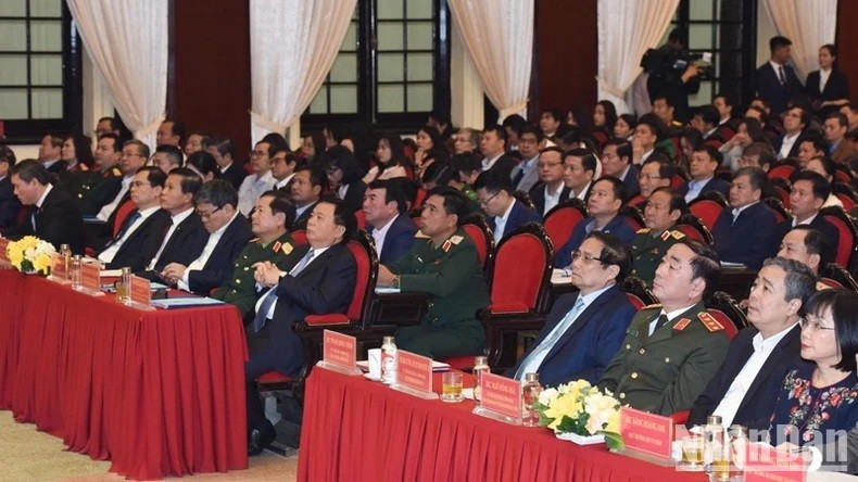 Thủ tướng Chính phủ Phạm Minh Chính và đồng chí Nguyễn Xuân Thắng tới dự và đồng chủ trì hội nghị toàn quốc về giáo dục quyền con người. (Ảnh: Trần Hải/Báo Nhân Dân)