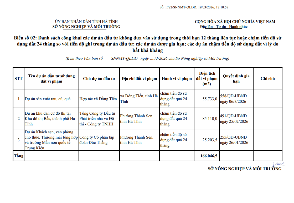 Trên cơ sở các Quyết định của UBND tỉnh về việc gia hạn tiến độ sử dụng đất của các dự án, Sở Nông nghiệp và Môi trường thông báo: