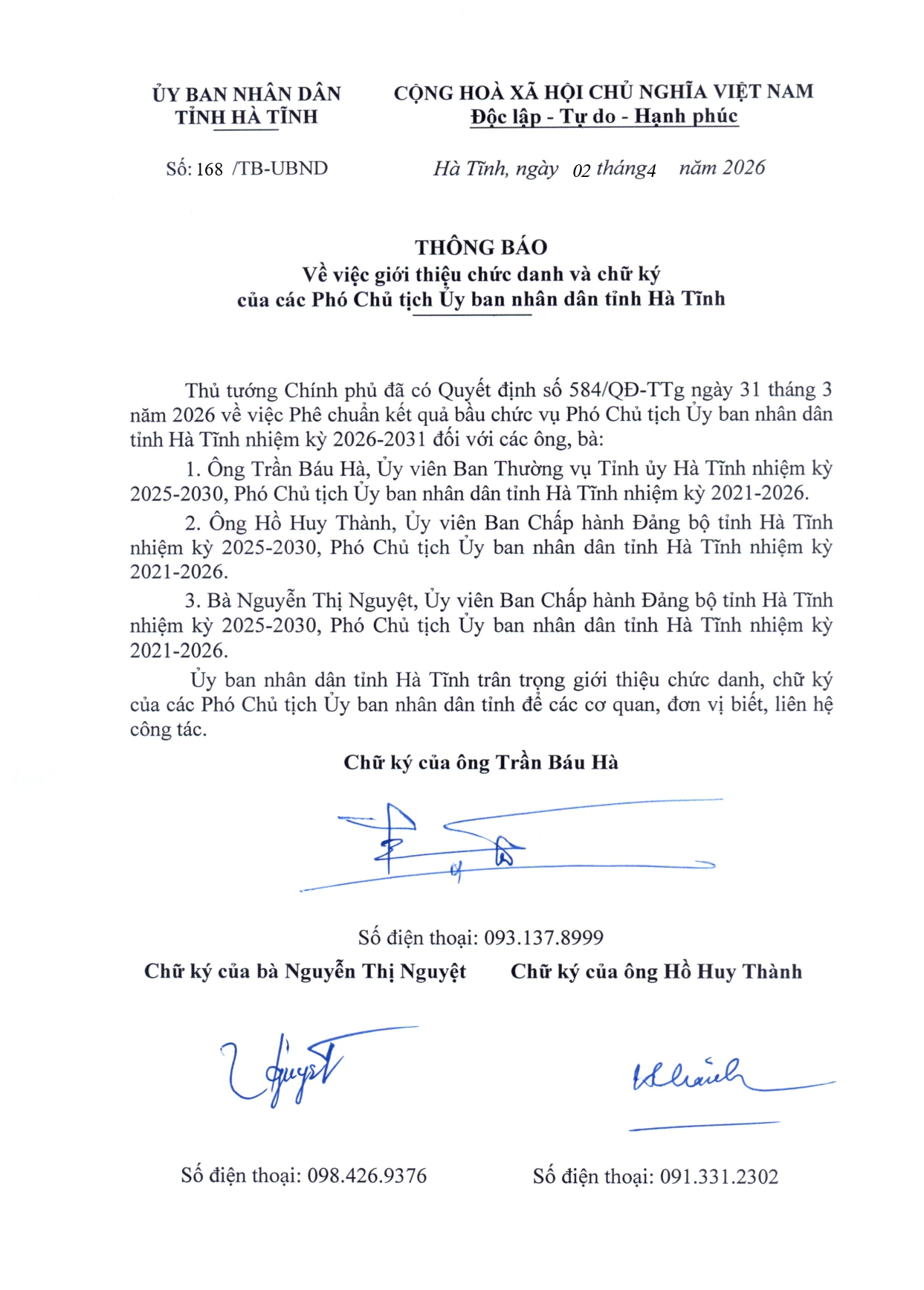 Ủy ban nhân dân tỉnh Hà Tĩnh vừa ban hành thông báo về việc giới thiệu chức danh và chữ ký của các Phó Chủ tịch UBND tỉnh nhiệm kỳ 2026–2031, nhằm phục vụ công tác liên hệ, phối hợp giữa các cơ quan, đơn vị.